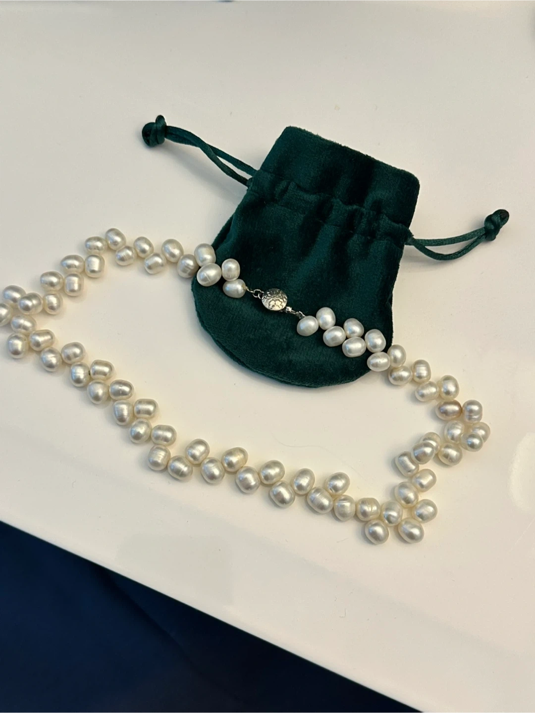 This beautiful freshwater pearl necklace features irregular white pearls strung together. It comes with a dark green velvet pouch for storage. The clasp is silver-tone metal.