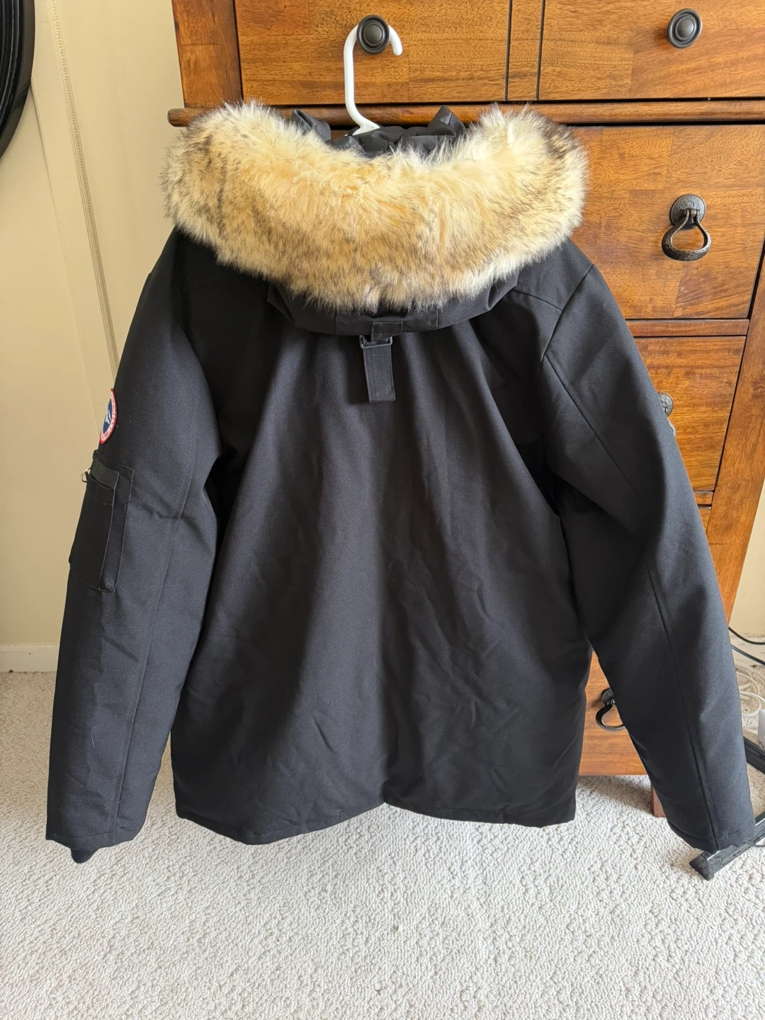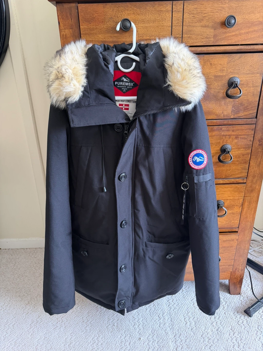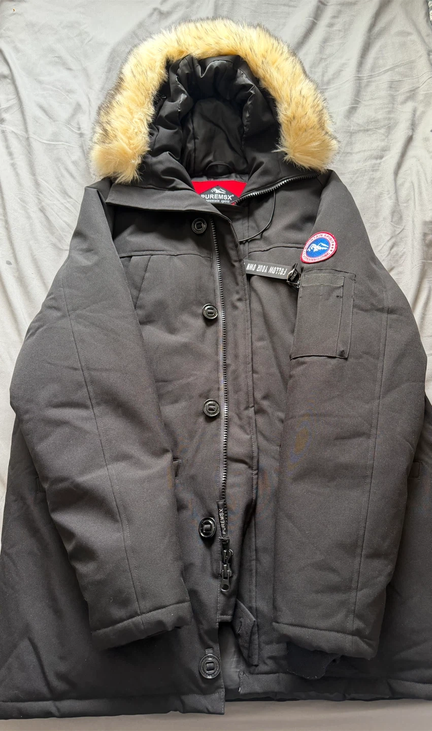 This black parka jacket is from PUREMSX. It features a faux fur-lined hood and a durable exterior perfect for colder weather. Multiple pockets offer convenient storage.