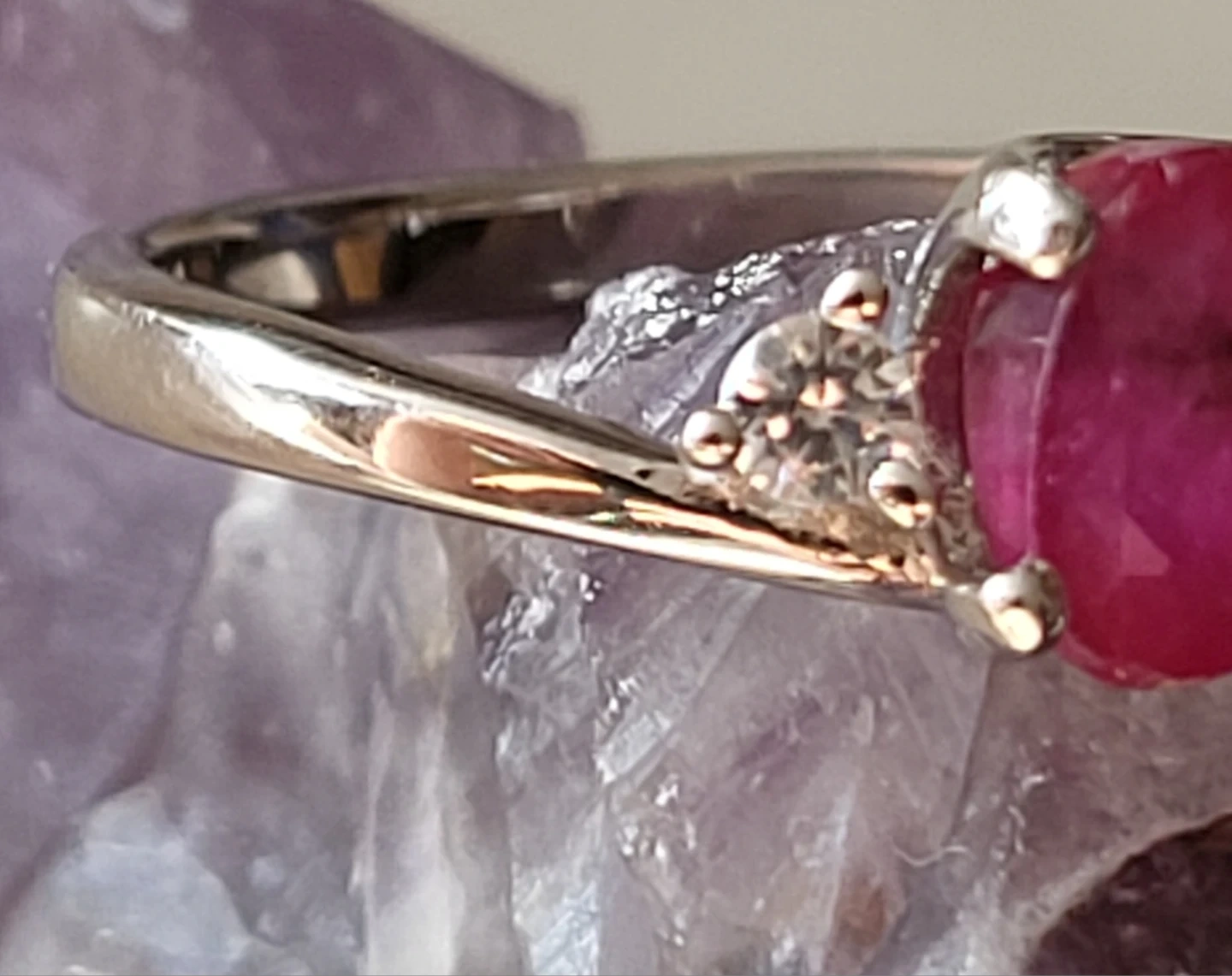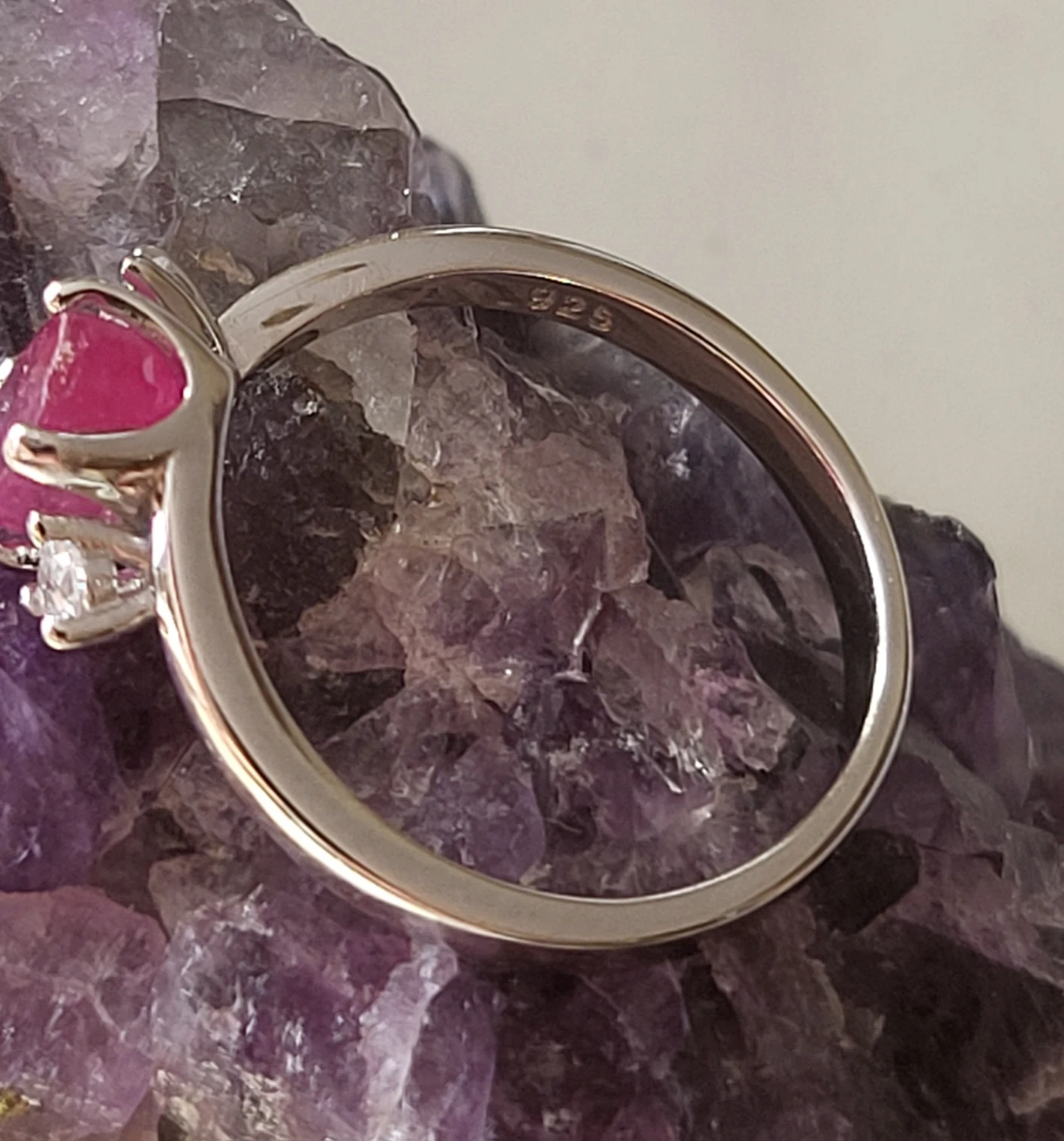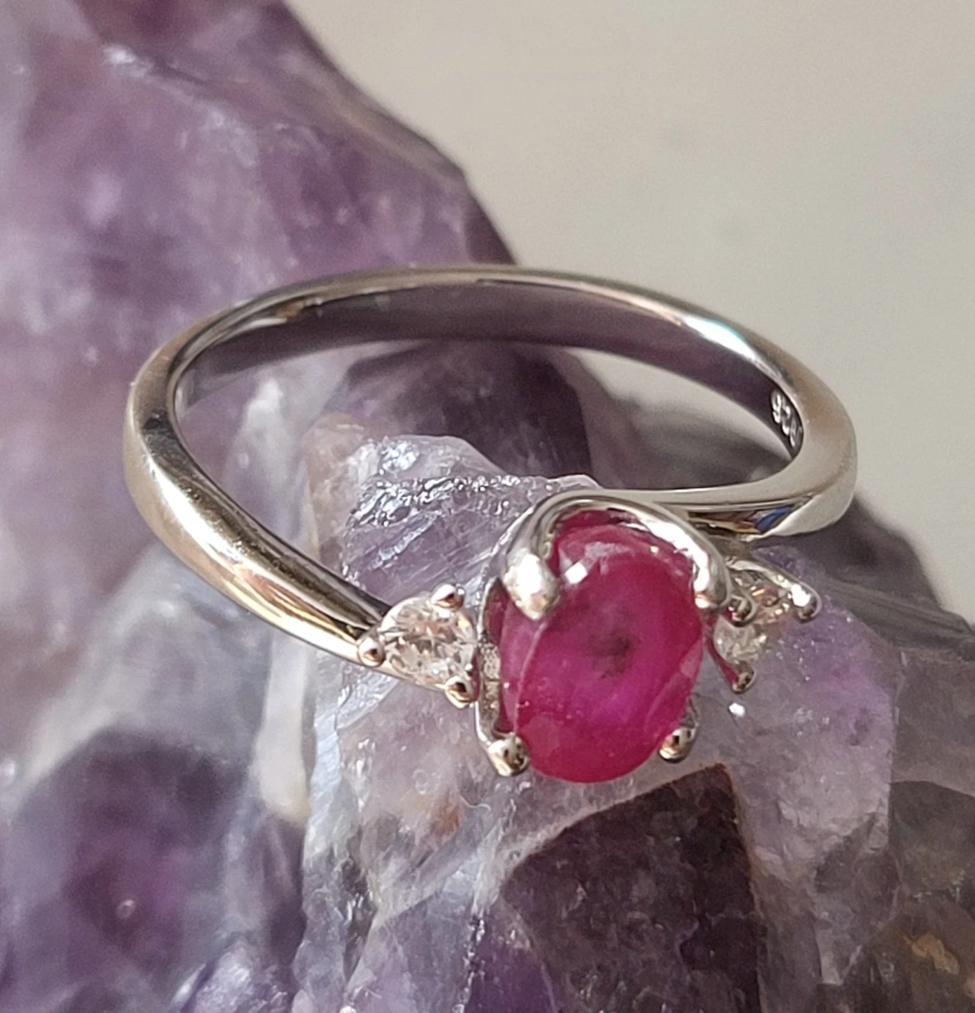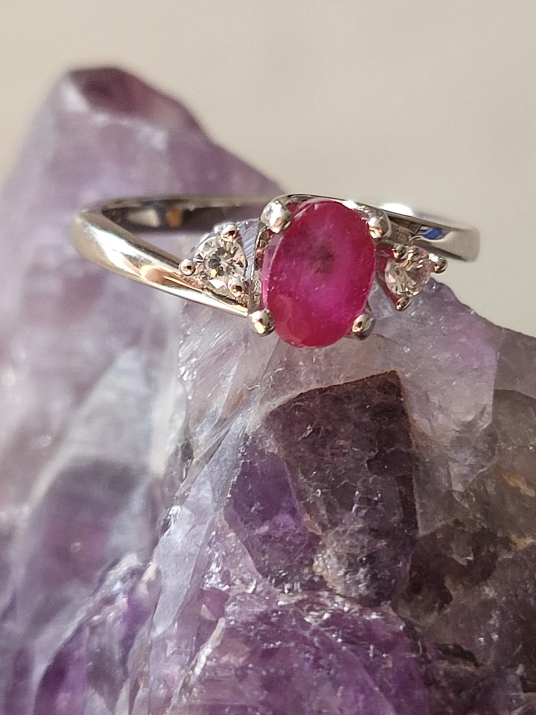This ring features an oval-cut ruby center stone, flanked by two smaller accent stones. It's crafted from sterling silver. The band has a delicate twist design. This piece would make a lovely addition to any jewelry collection!