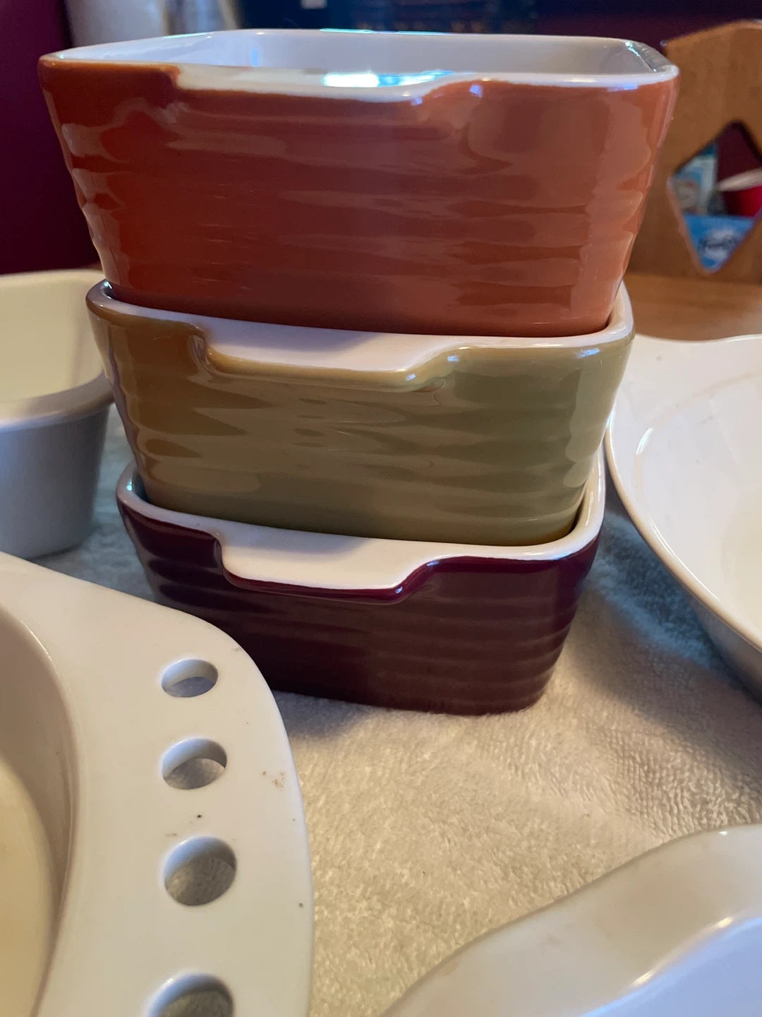 This set includes a variety of ceramic baking dishes. There's a large rectangular dish, a round pie plate, a small lidded pot, and a stack of four small ramekins in assorted colours. They're suitable for many baking needs!