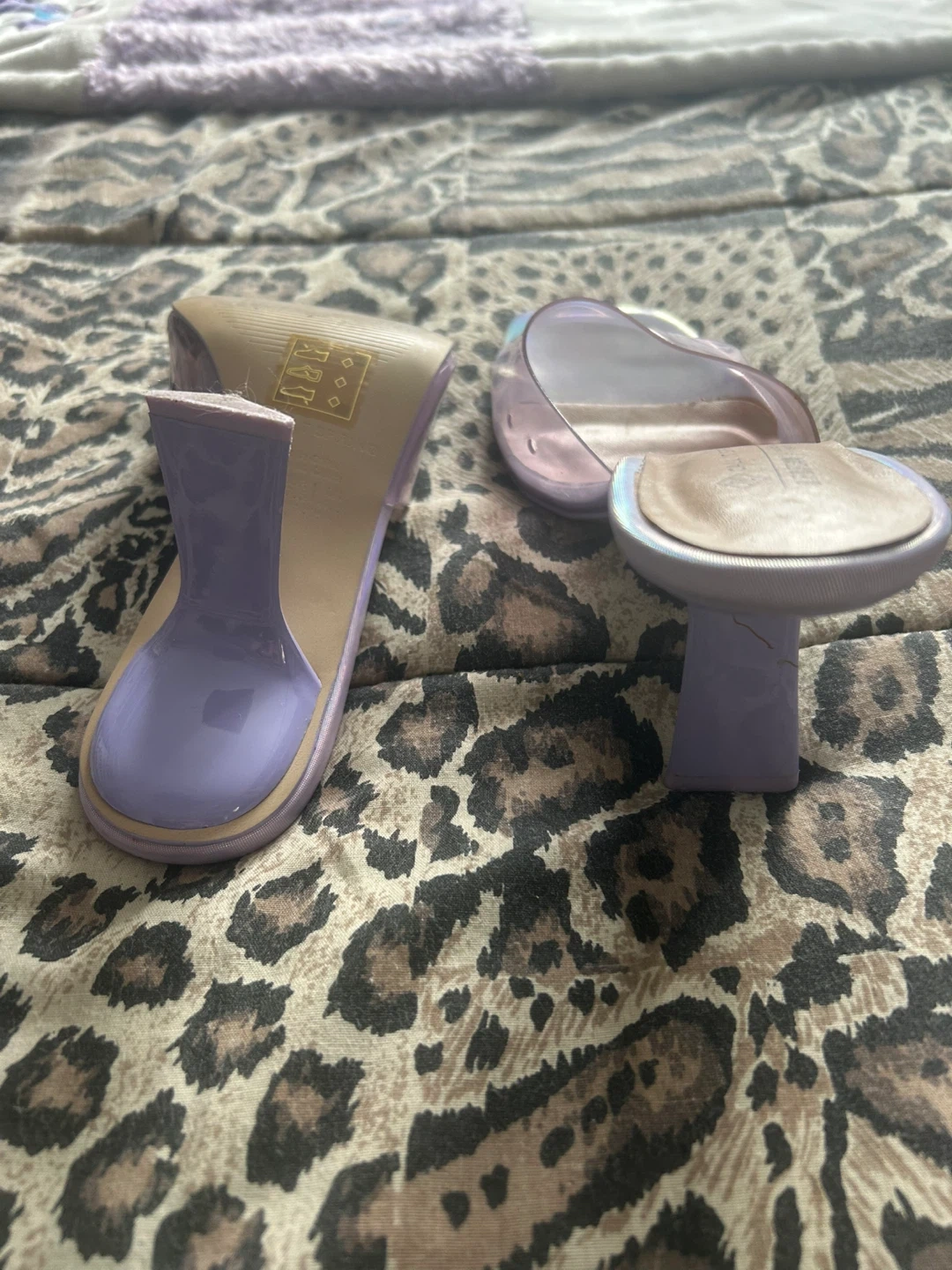 These Call It Spring heels are a stylish choice. They feature clear iridescent straps and a square toe design. The heel height appears to be around 3 inches. They're a fun addition to any outfit!