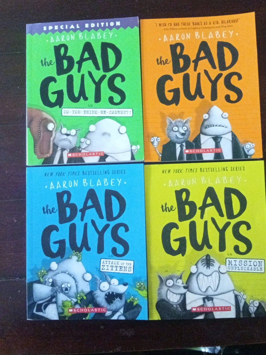 This is a set of four books from Aaron Blabey's 'The Bad Guys' series. Titles include 'Do You Think He-Saurus?!', 'Attack of the Zittens', and 'Mission Unpluckable'. These are Scholastic editions of the New York Times bestselling series. These books are great for young readers.