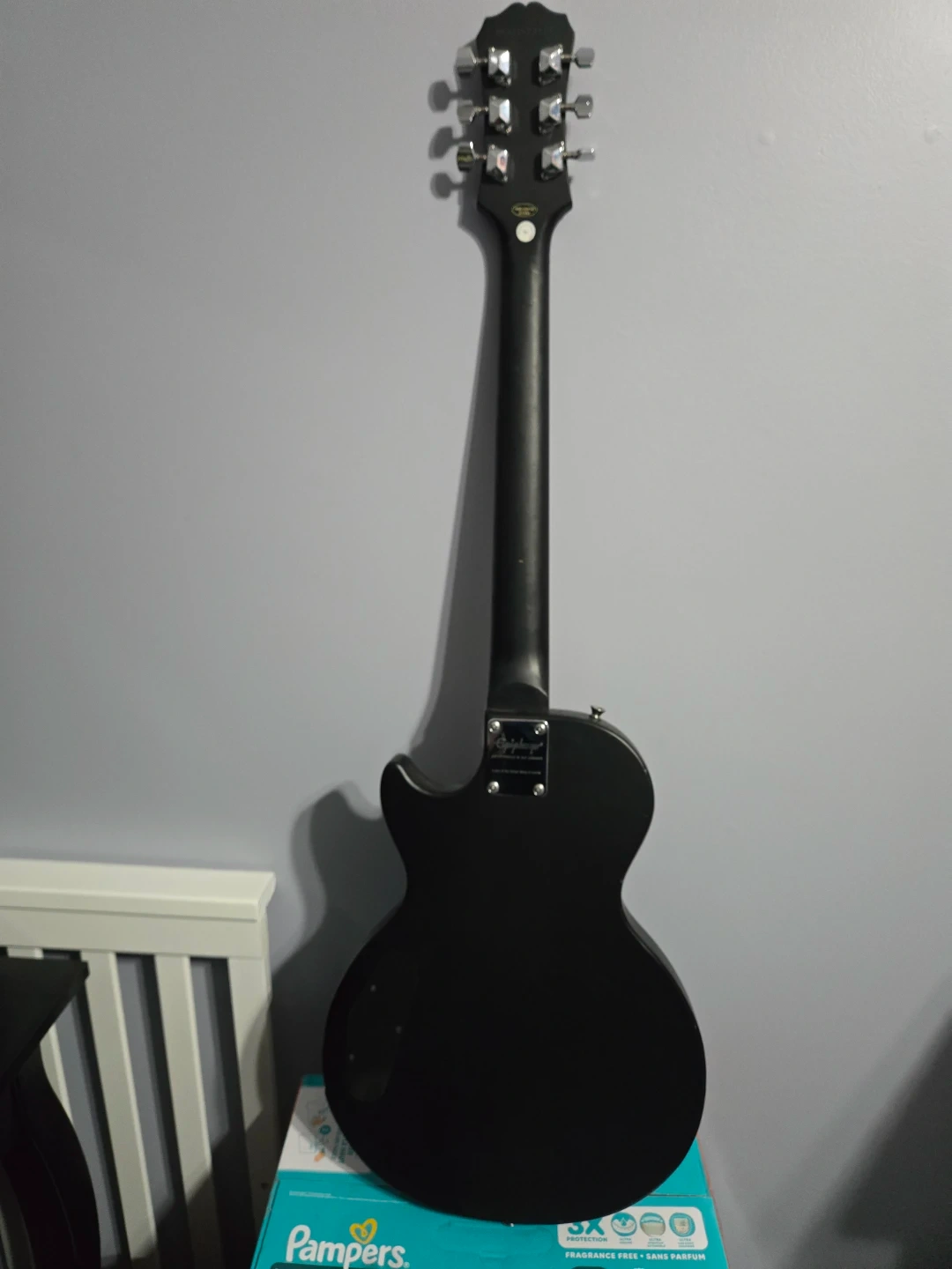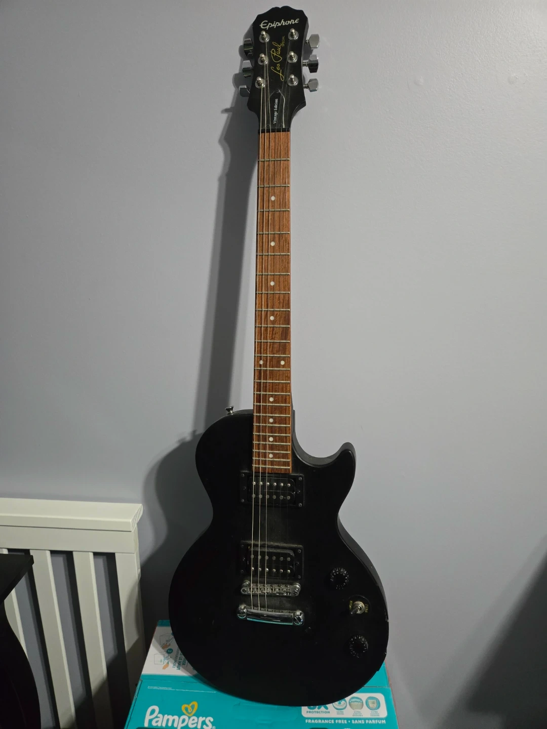 Up for grabs is a black Epiphone Les Paul electric guitar. It has a smooth wooden fretboard and standard guitar controls. This guitar is ready for its next jam session!