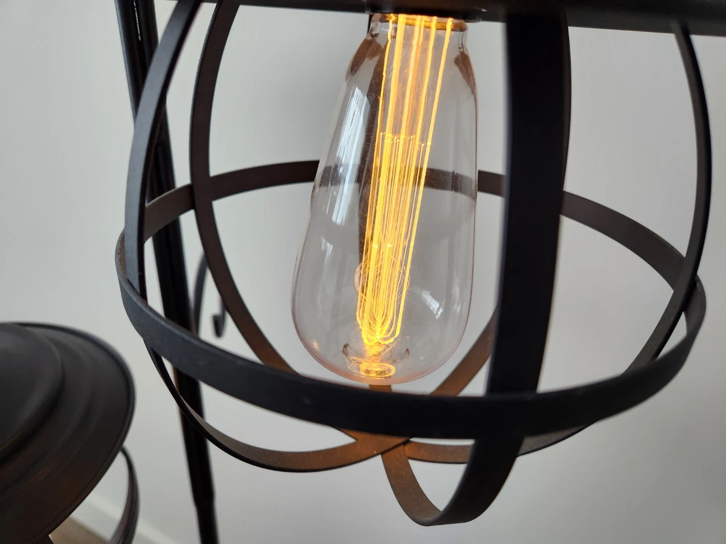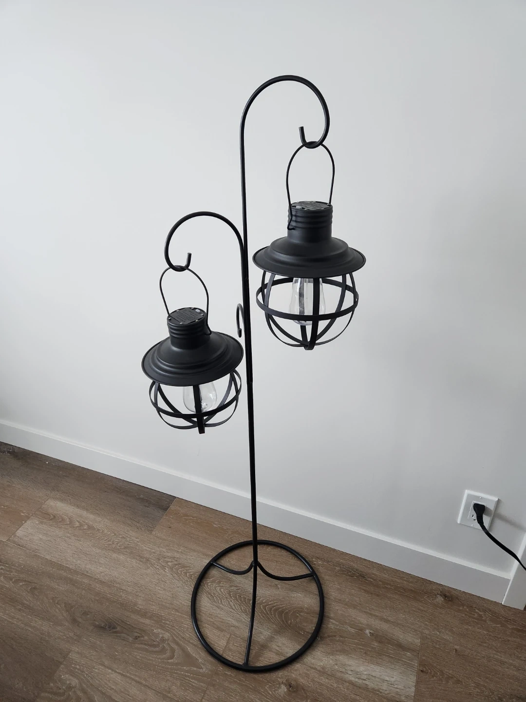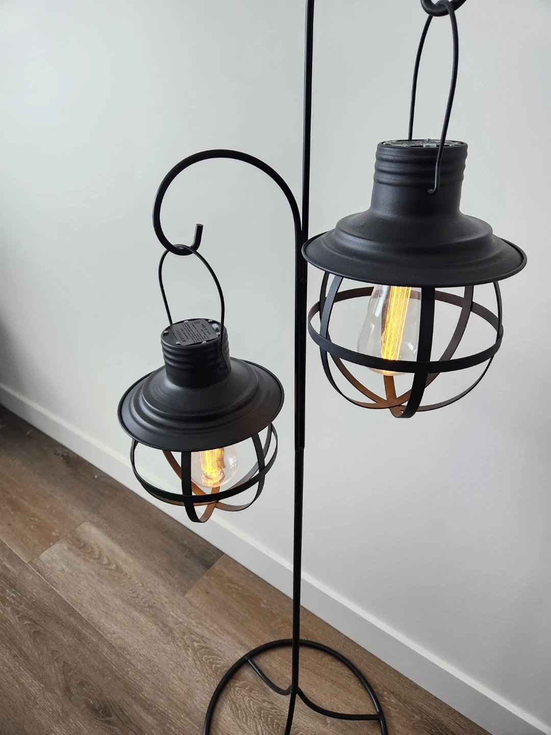This black metal floor lamp has a triple arm design. It's a stylish addition to any living space, providing ambient battery powered lighting. The caged lantern style offers a unique look. Cash only