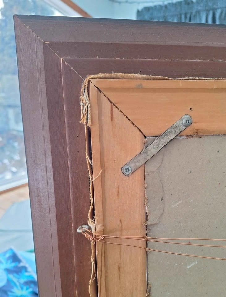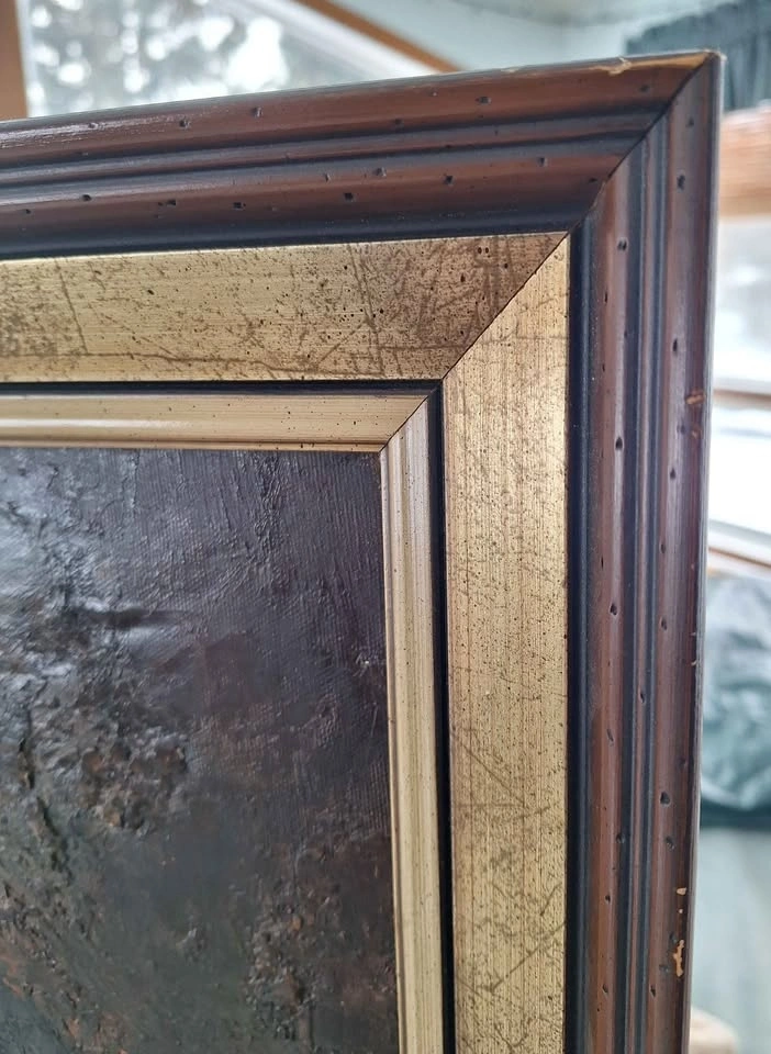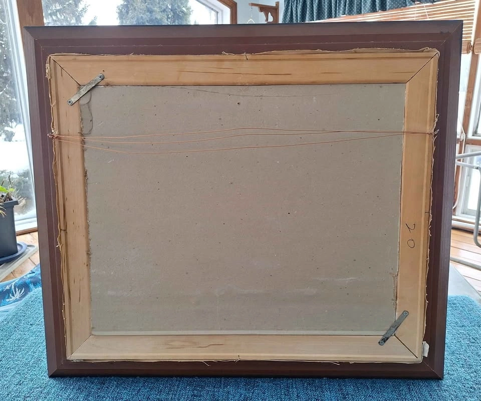 Original oil painting on canvas in a heavy wooden frame by "Laurence". The frame has minor scuffs and measures approximately 28.5" x 24.5" x 2.25" deep. Pick up is in the Bloomington and 9th line area.