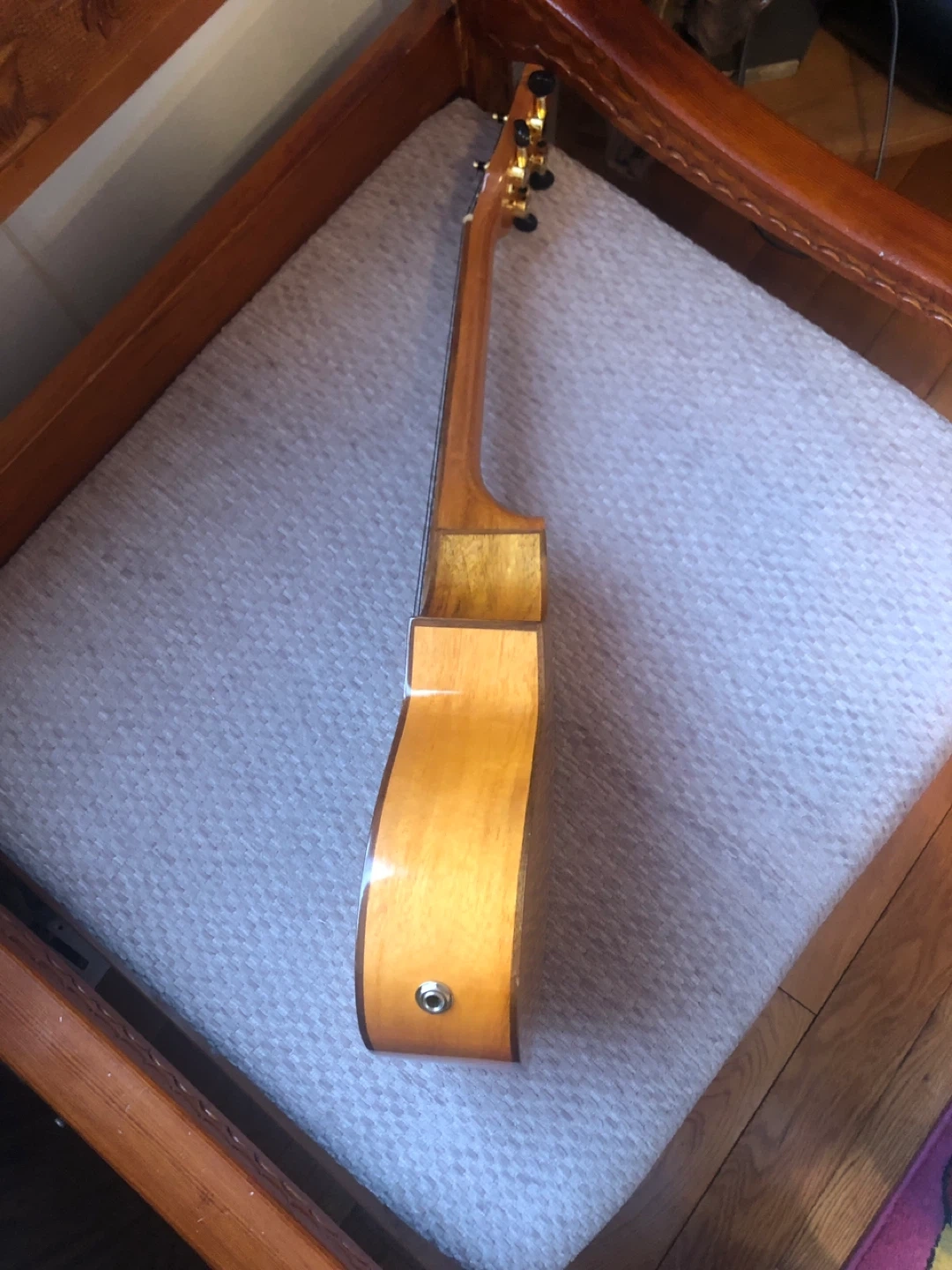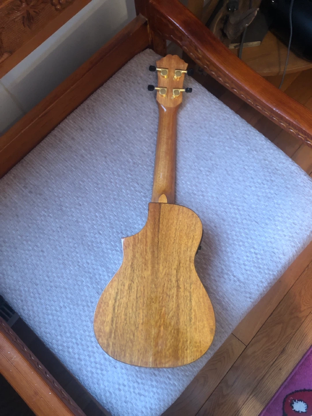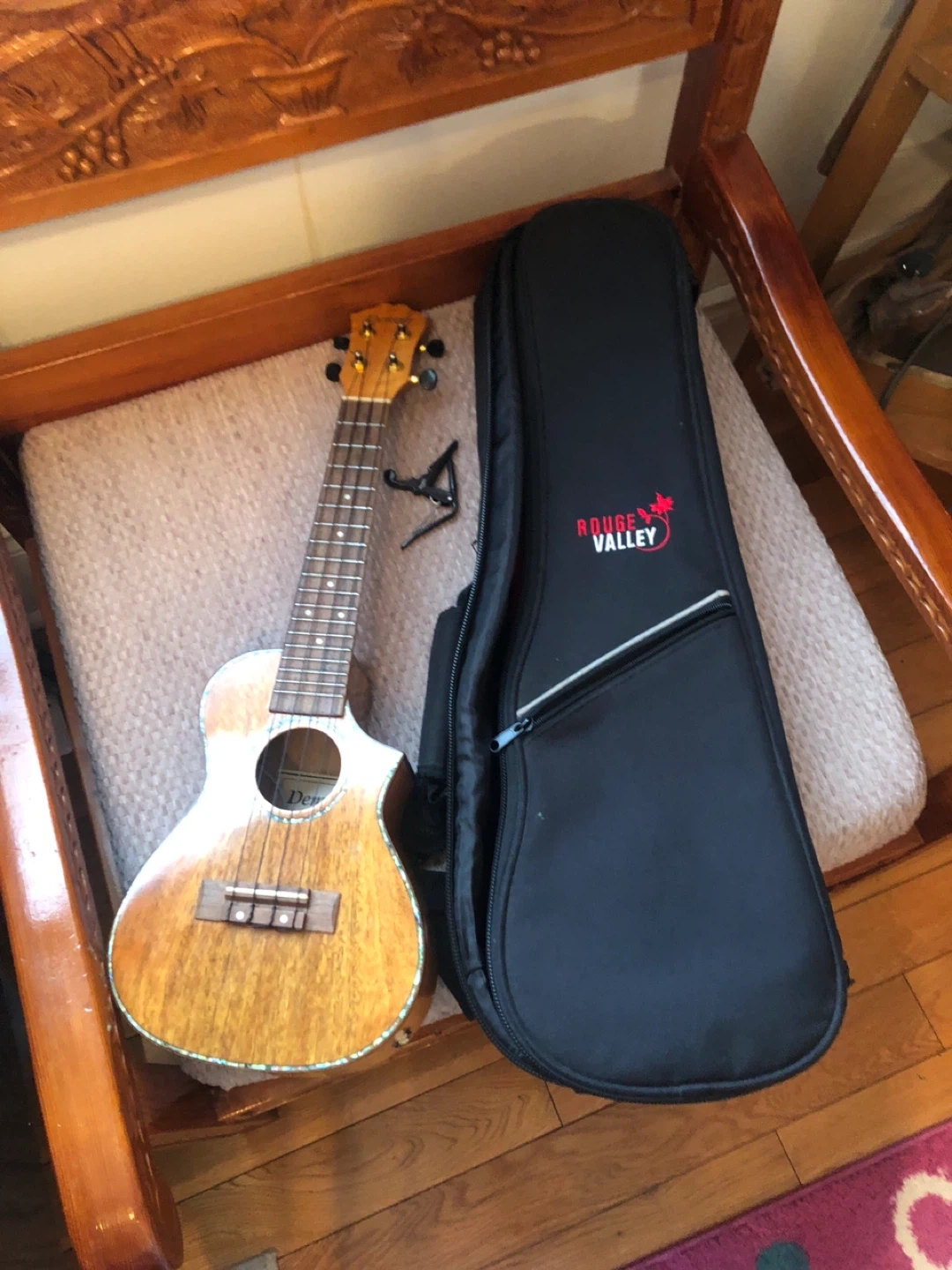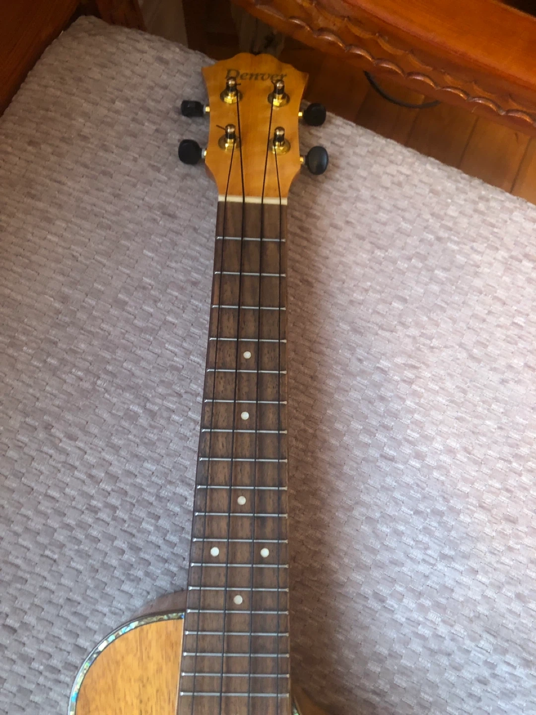 This is a Denver brand electric ukulele. It includes a black gig bag for easy transport and a capo. The ukulele has a natural wood finish and a built-in tuner.