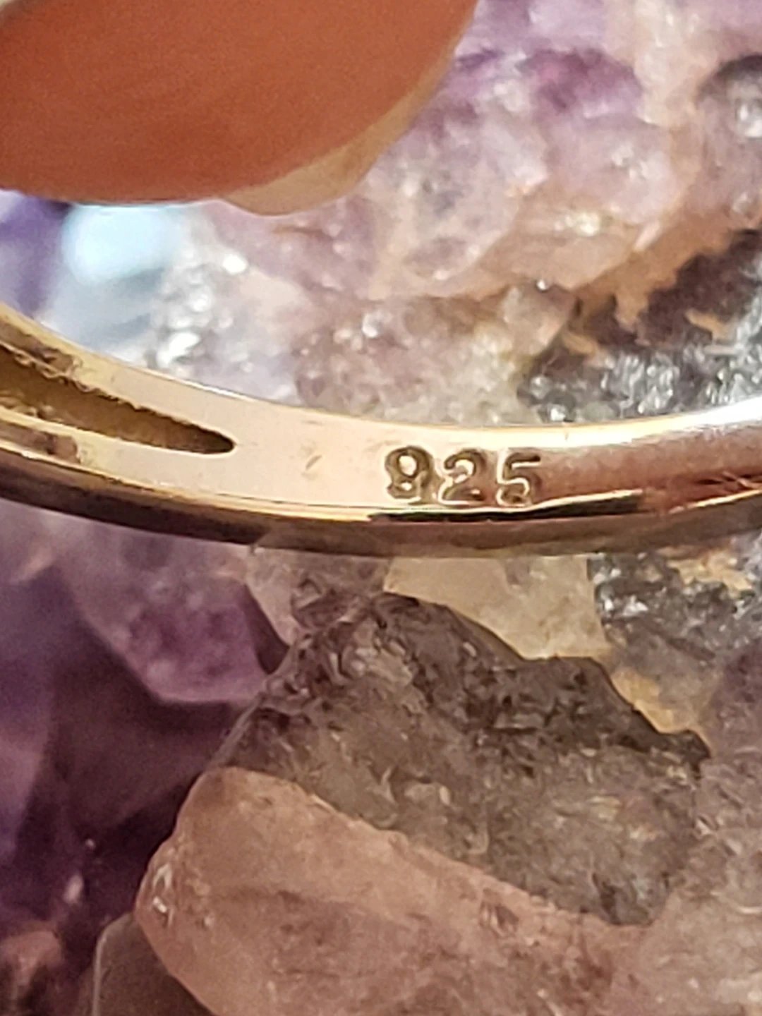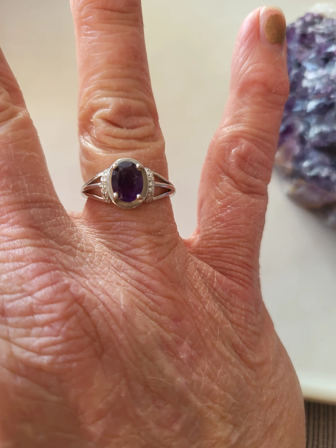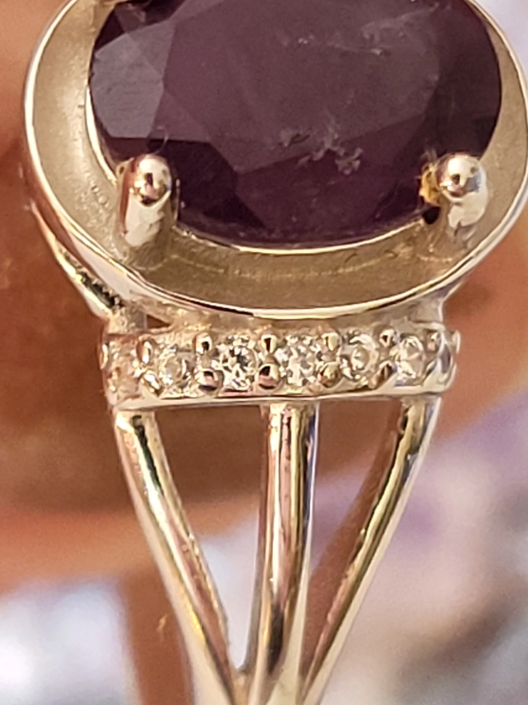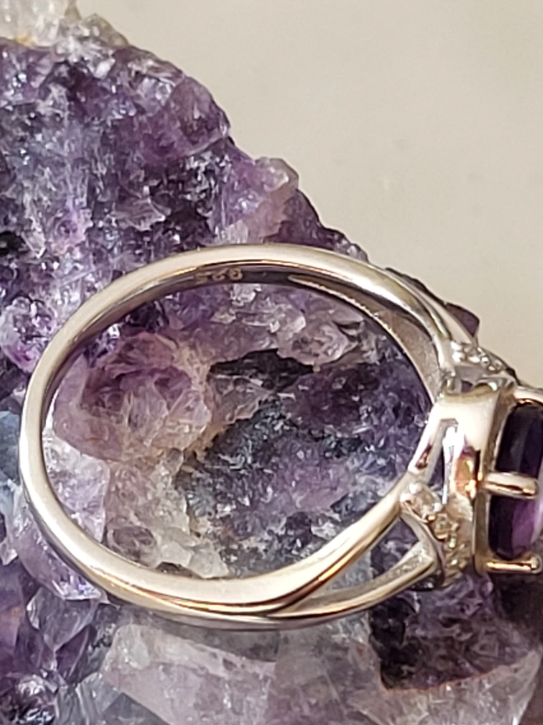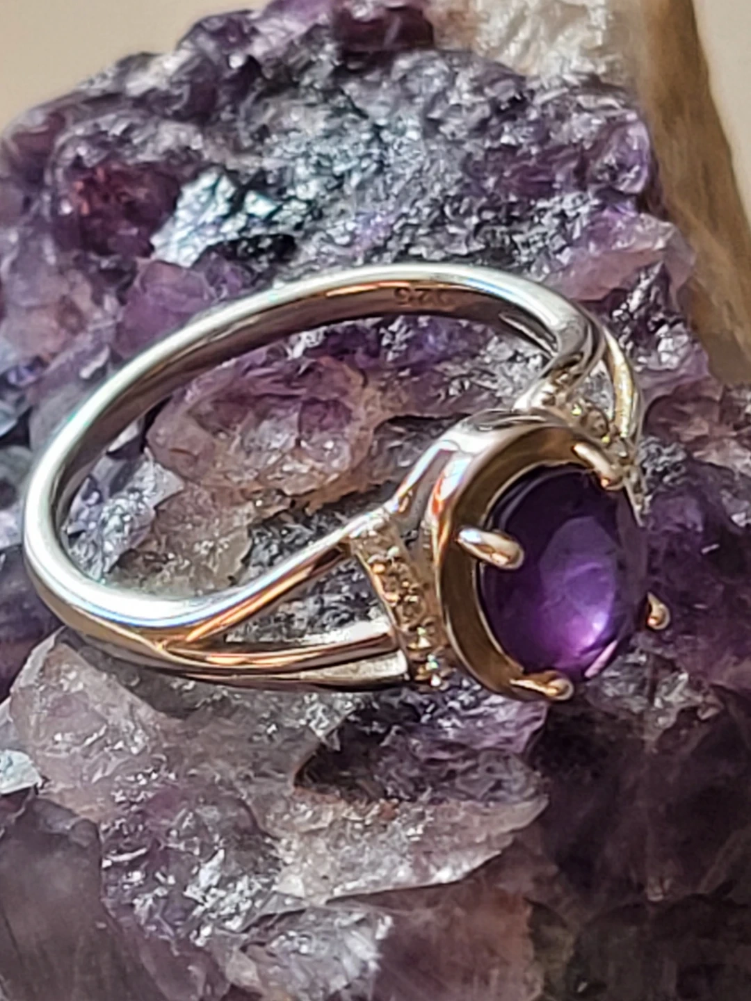 Beautiful oval-cut amethyst ring set in sterling silver. Features small accent stones on the band for extra sparkle. Stamped with "925" indicating sterling silver quality.
