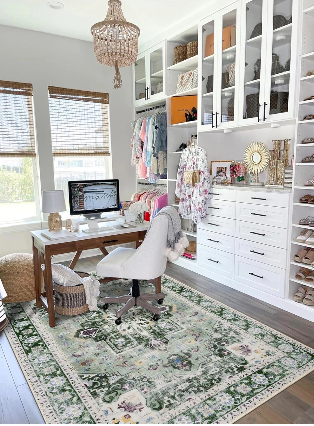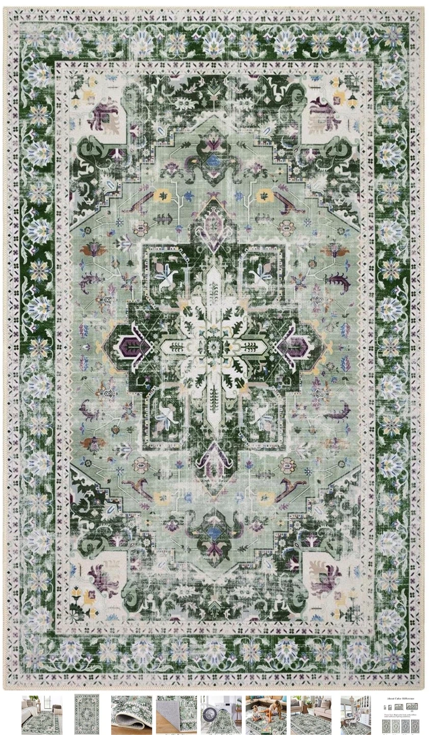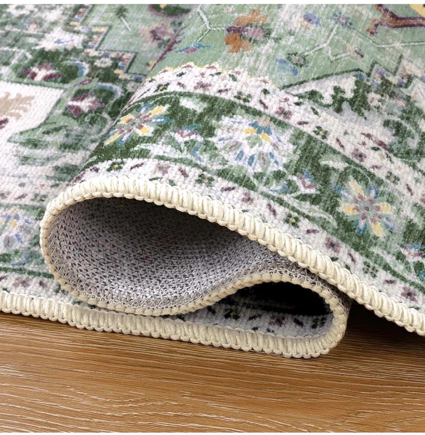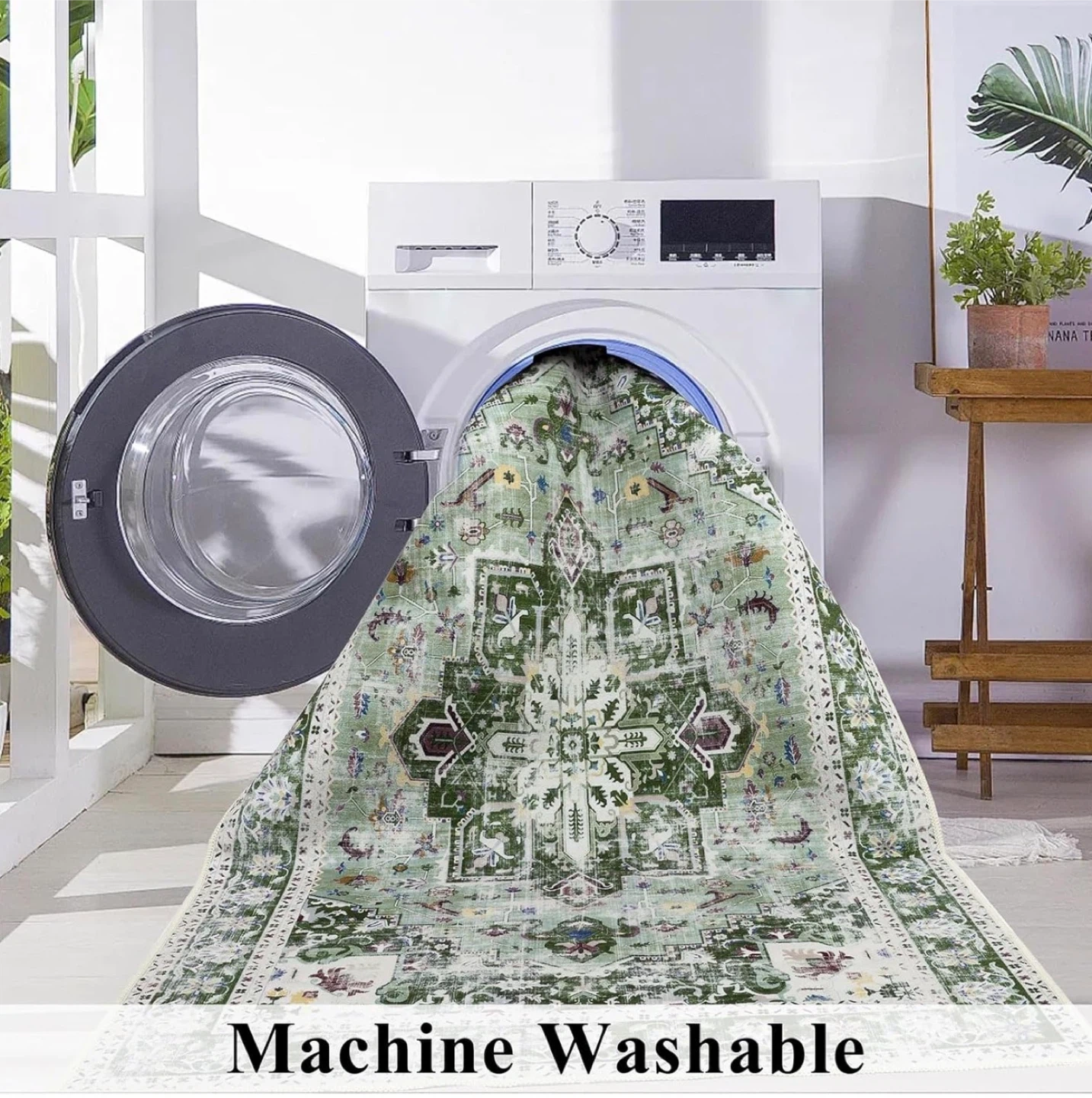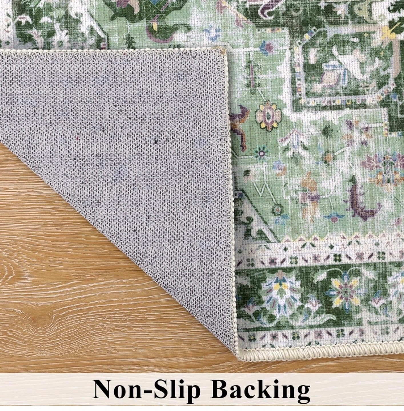 Add a touch of elegance to your home with this beautiful Persian-style area rug. It's super soft and machine washable, making it a practical choice for any busy household. The non-slip backing ensures it stays in place, and it's family-friendly. It features a vintage-inspired pattern in green and cream.