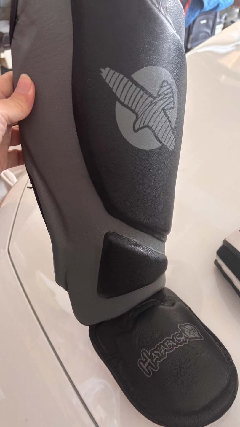 These Hayabusa shin guards are size XL and made of leather. They are designed for combat sports. They offer protection for your shins.