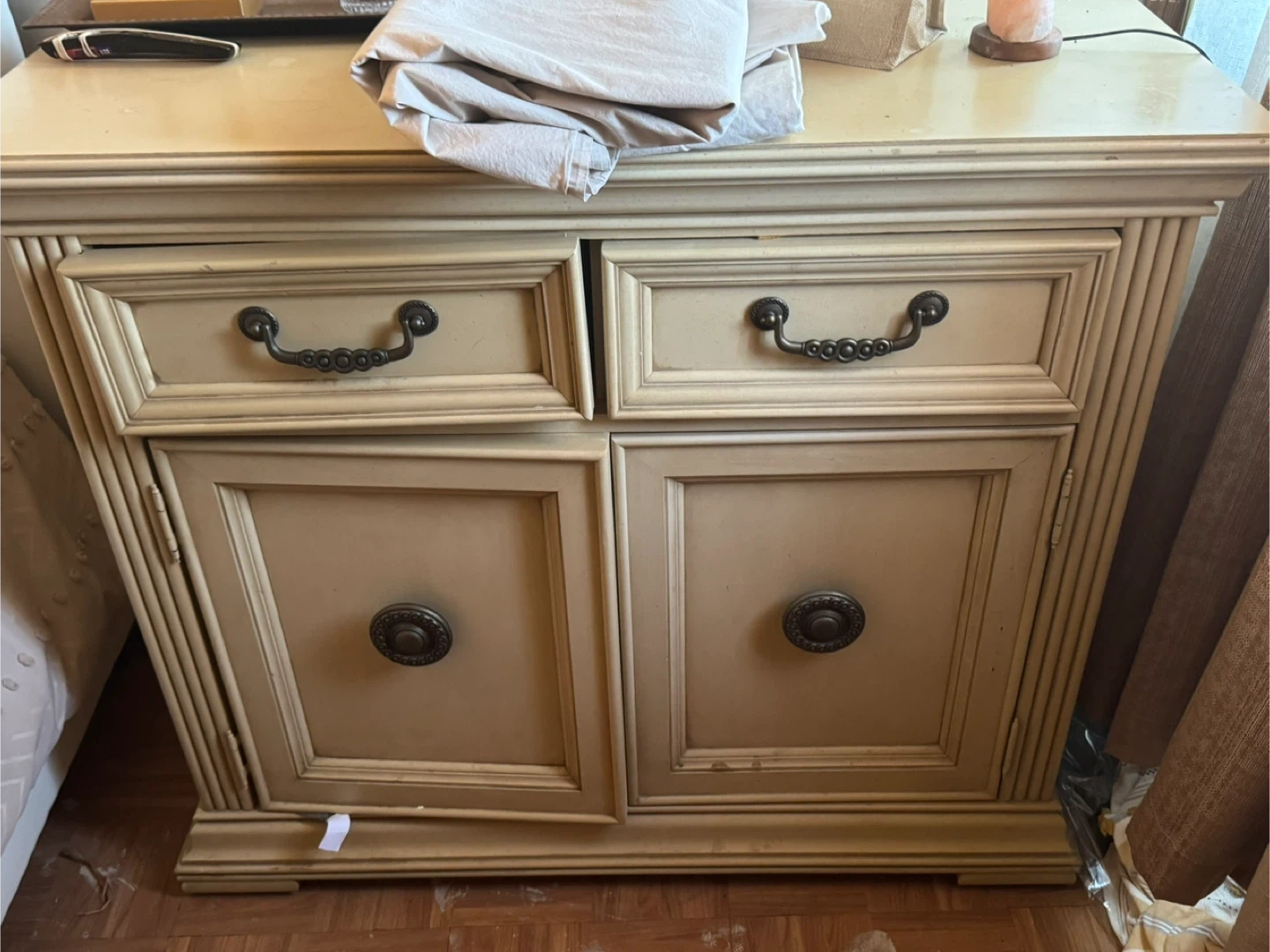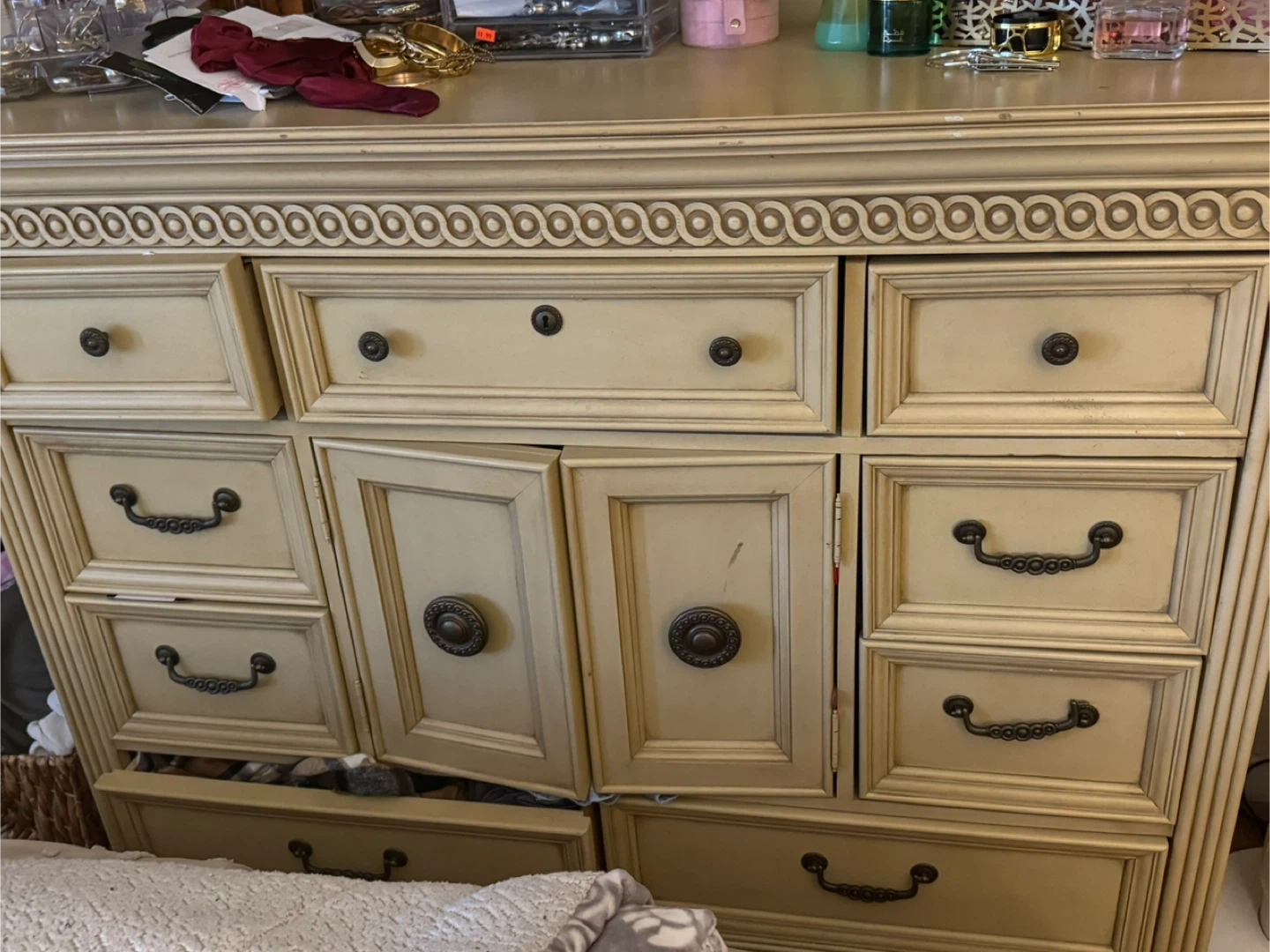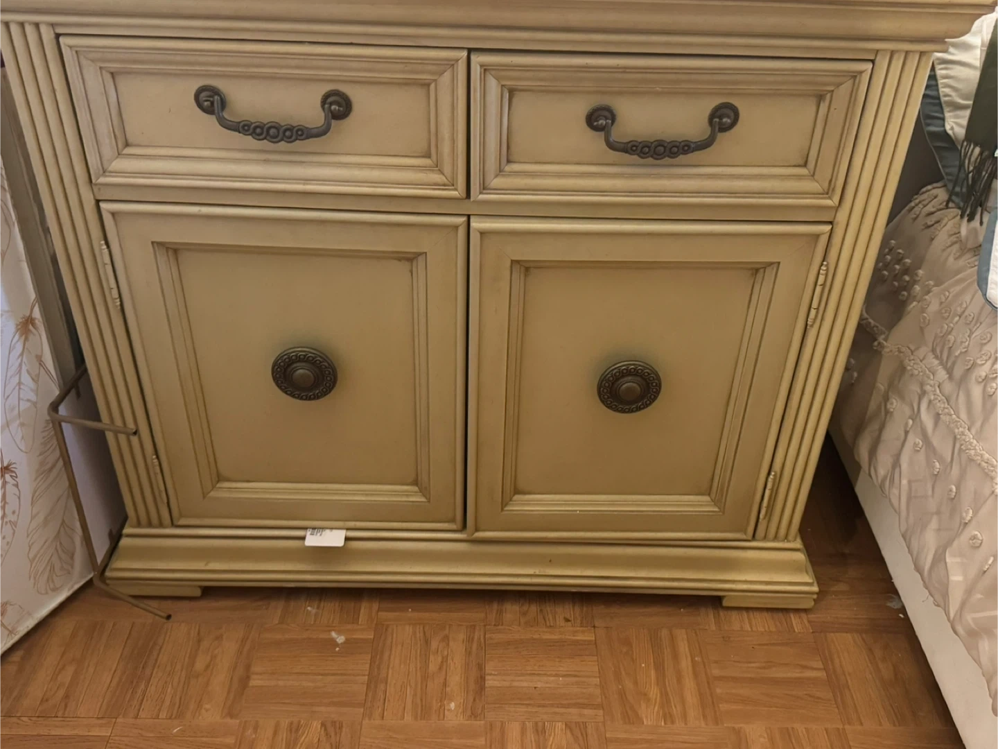 This cream-colored bedroom set includes a dresser with multiple drawers and cabinets, plus a tall wardrobe with double doors. Both pieces have ornate detailing and dark metal hardware. They're a great addition for bedroom storage!