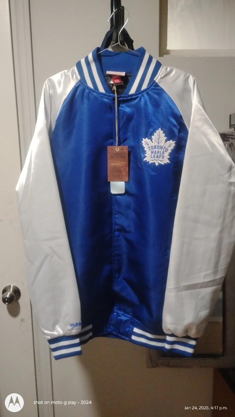 This Mitchell & Ness bomber jacket is in a classic royal blue and white satin. It features the Toronto Maple Leafs logo embroidered on the front. It's perfect for any hockey fan wanting to show their team pride!