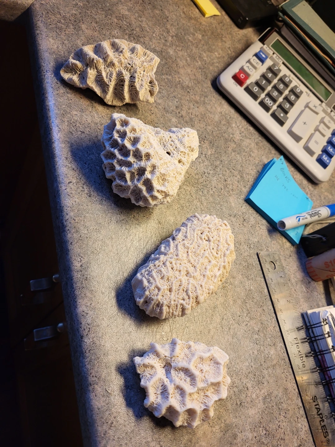 Four unique natural coral pieces with intricate honeycomb patterns. These decorative natural items add a touch of the ocean to any space. Decorative pieces, perfect for display or crafting.