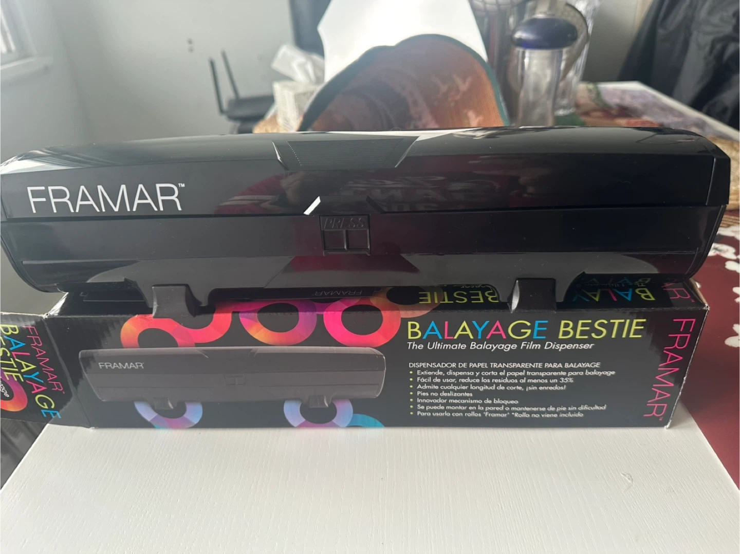 This is the Framar Balayage Bestie Ultimate Film Dispenser. It's designed for easy extension, dispensing, and cutting of balayage film. It helps reduce waste and maintains precise cutting length.
