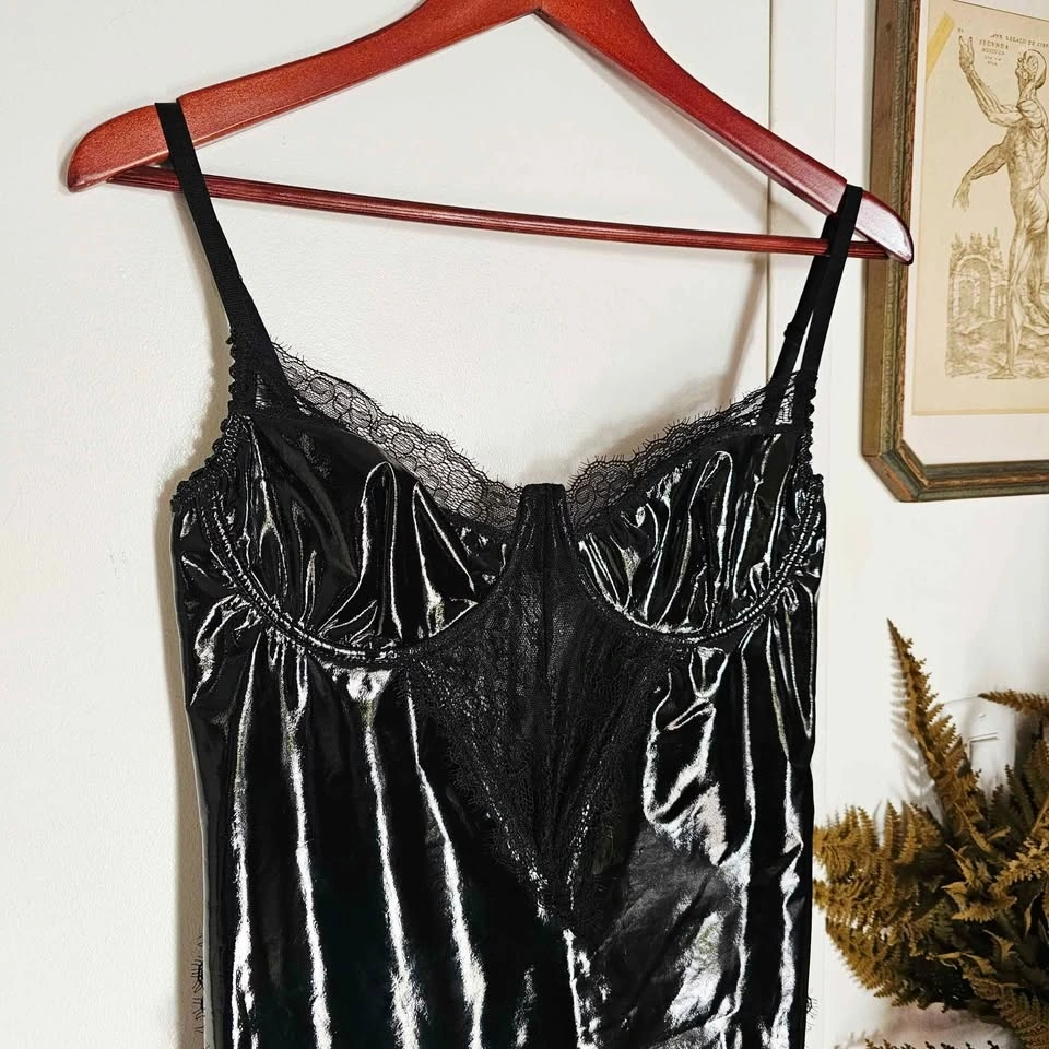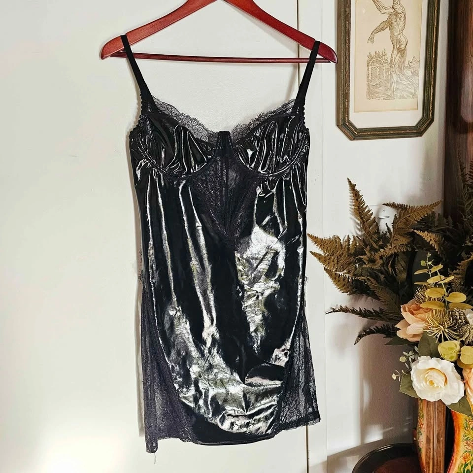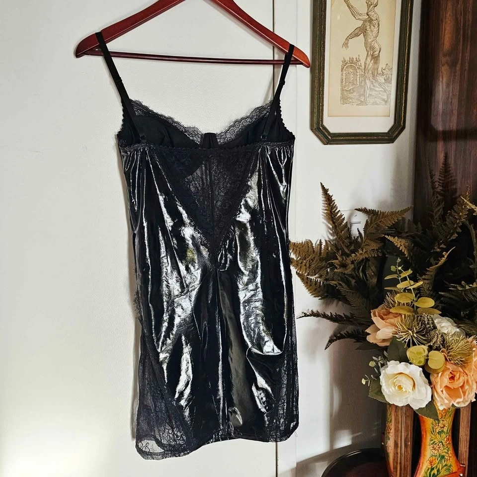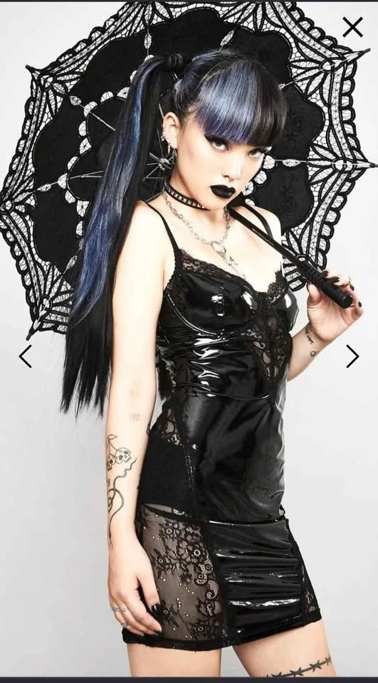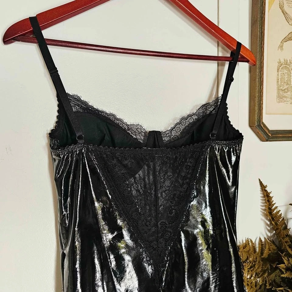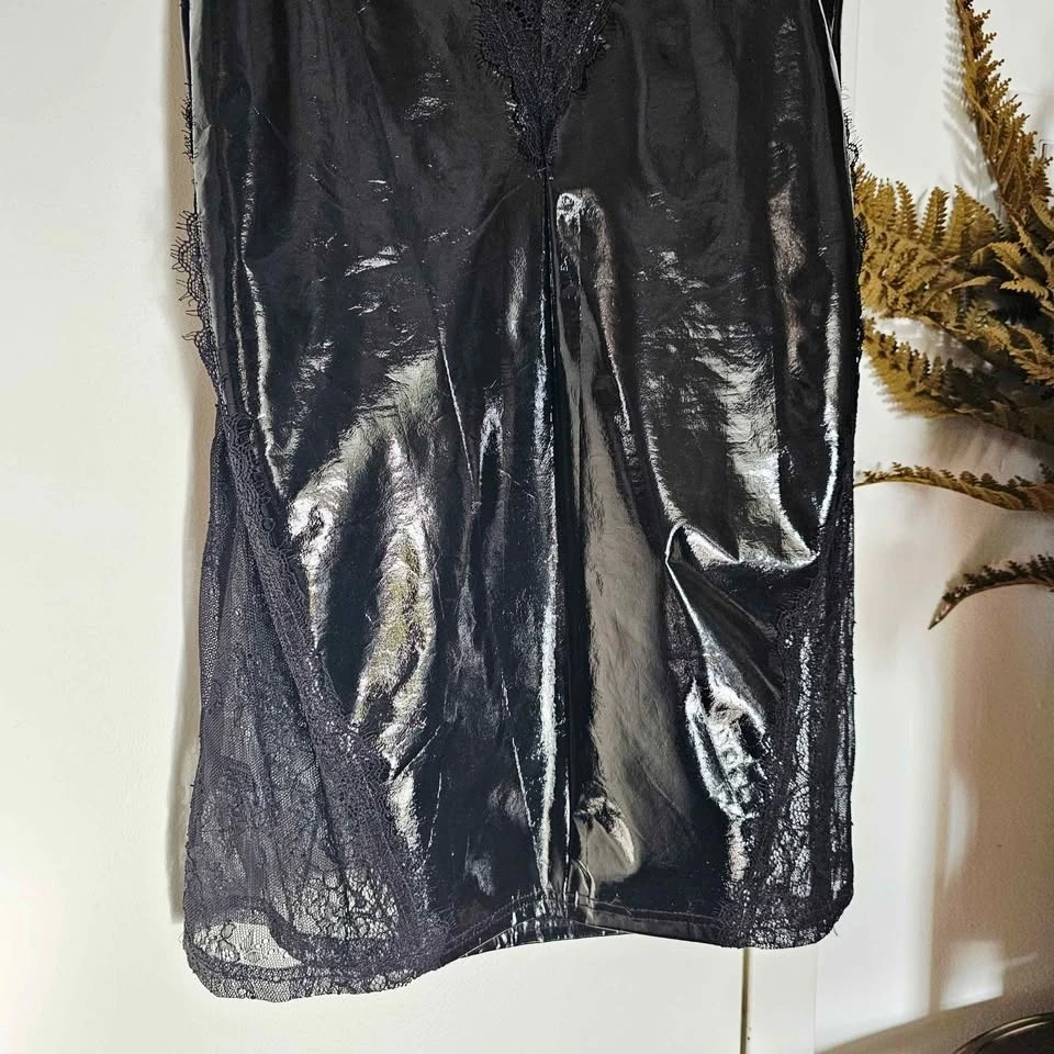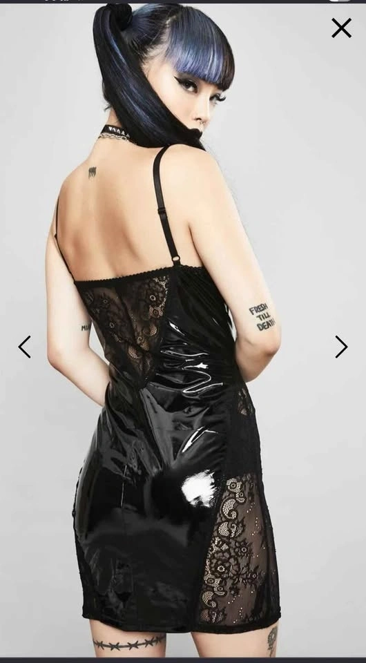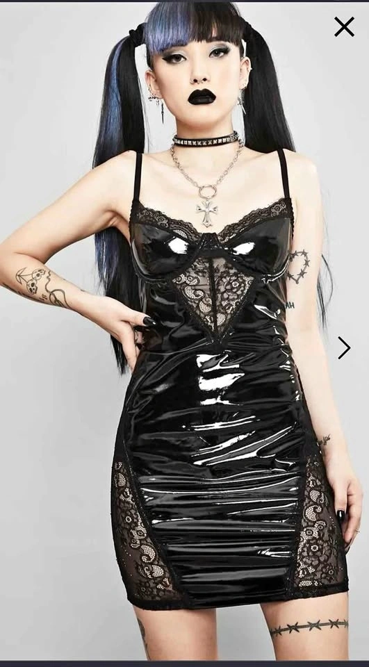 Smoking hot Twisted Desire glossy black vinyl strappy minidress from Dolls Kill goth brand Widow. Dress has black vinyl panels that have a pvc-style look and stretchy black lace cutouts at the chest, back, and on the thighs/ hips. There is built-in underwire support in the chest and the straps are adjustable. Dress closes with a hidden side zipper and is a women's US size Medium.