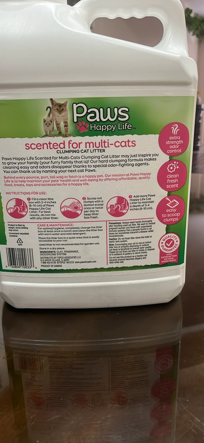 This Paws Happy Life cat litter is scented for multi-cats and offers extra strength odor control. It provides a clean, fresh scent and is easy to scoop. Made with clay and fragrance for optimal performance. Net weight is 20 lbs (9.07 kg). 1 for -$6 and 2 for $10. Selling 10 boxes