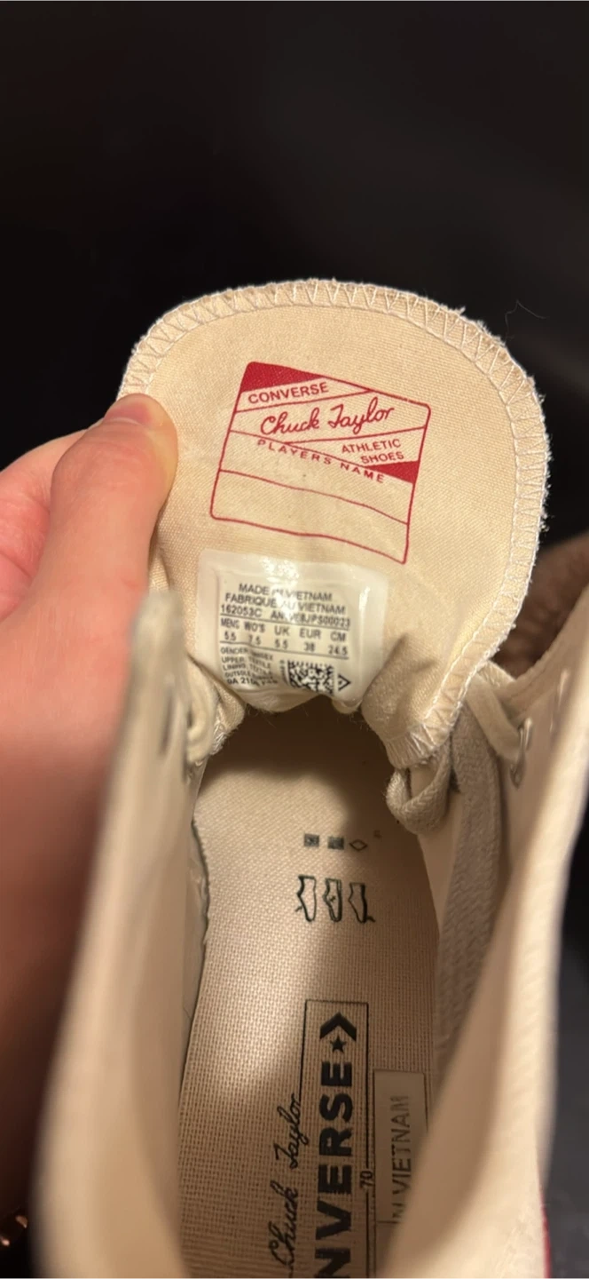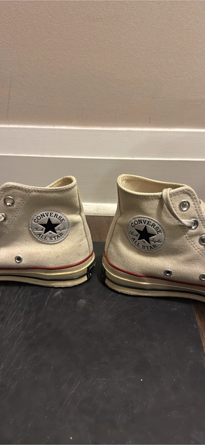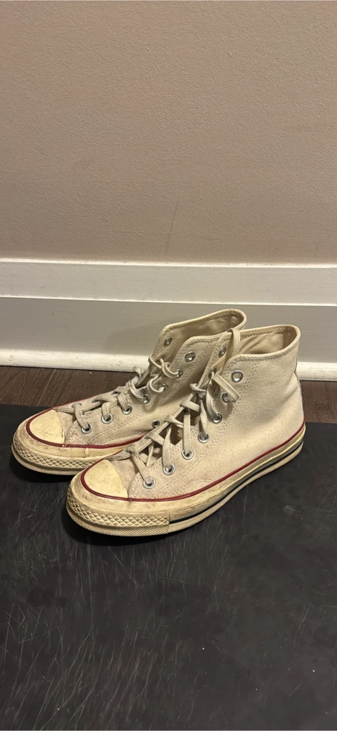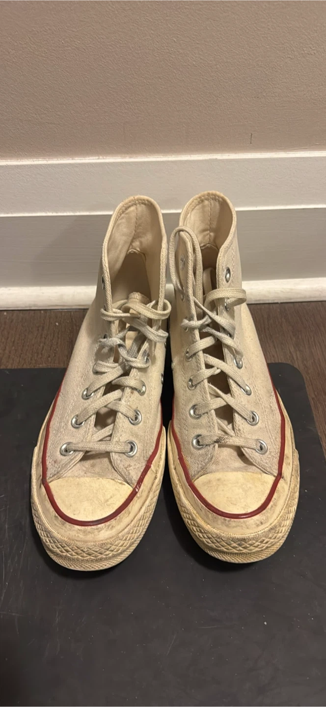Classic Converse Chuck Taylor All Star high top sneakers in a cream colour. In great condition, just a bit dirty on the outside!
