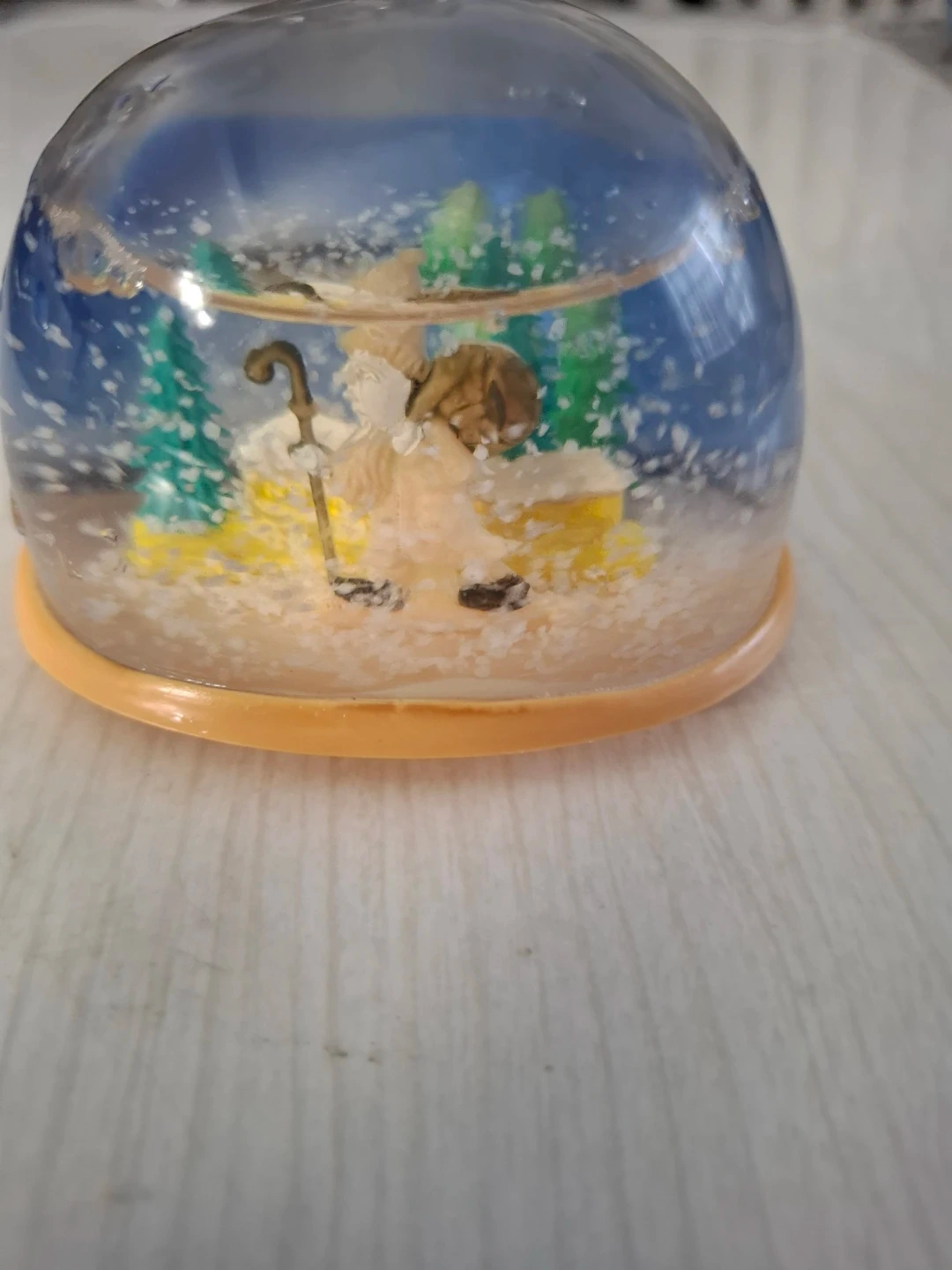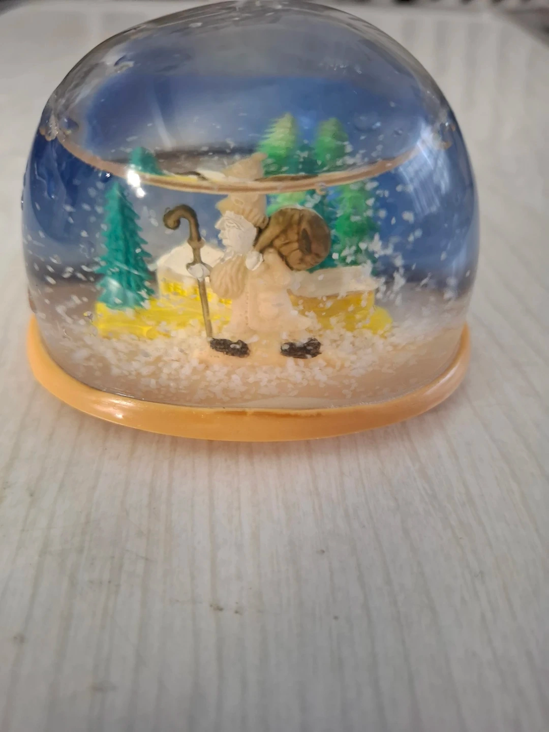 A charming snow globe featuring a festive winter scene with a person carrying a bag and a cane. It's perfect for adding a touch of holiday magic to your home decor. The globe is made of glass and sits on a decorative orange base.