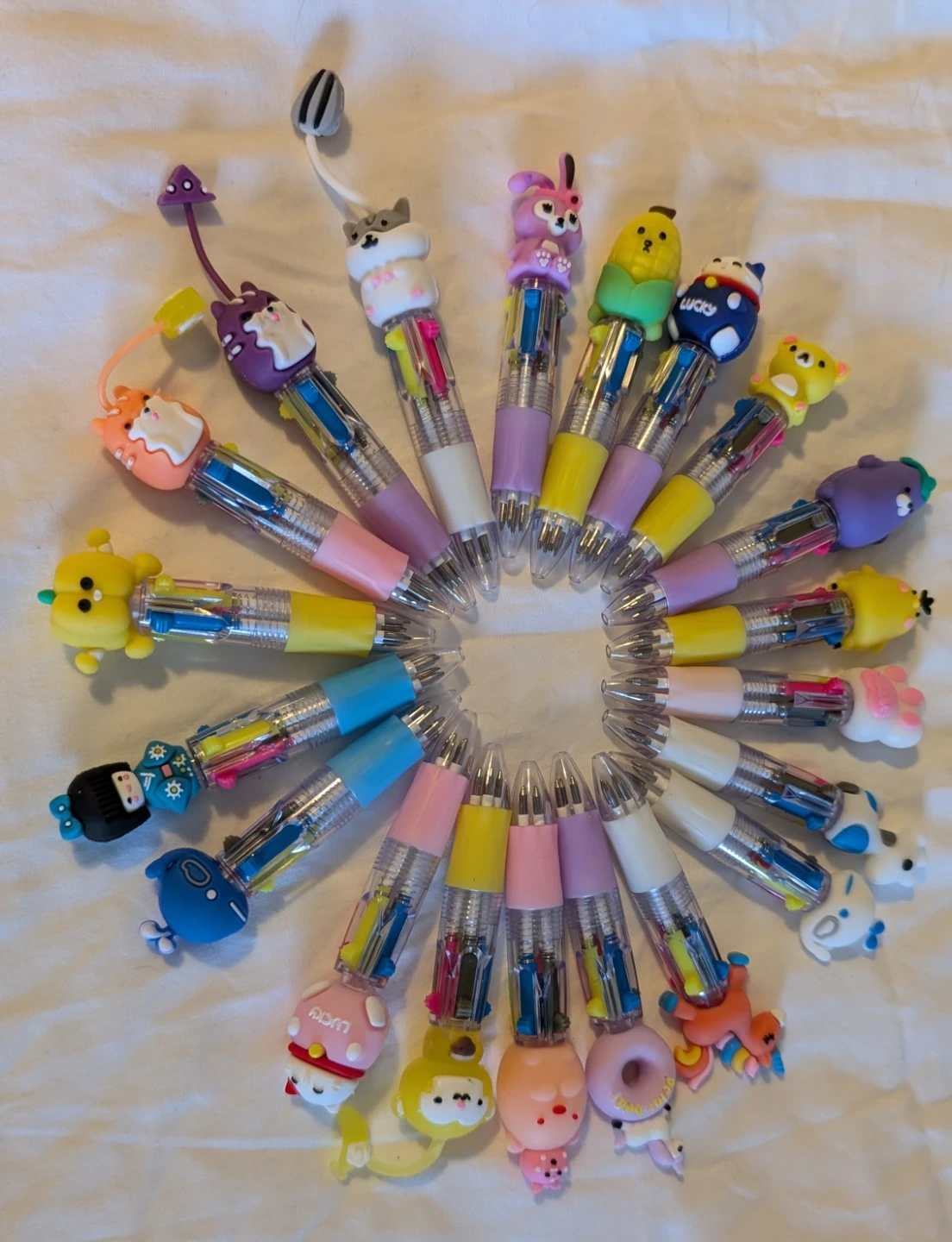 This fun set includes 20 multi-color pens, each topped with a cute kawaii charm like animals, food, or characters. They're perfect for adding a little joy to your note-taking or doodling. Each pen contains multiple ink colours, so you'll always have the right shade on hand! Sold as a full set.