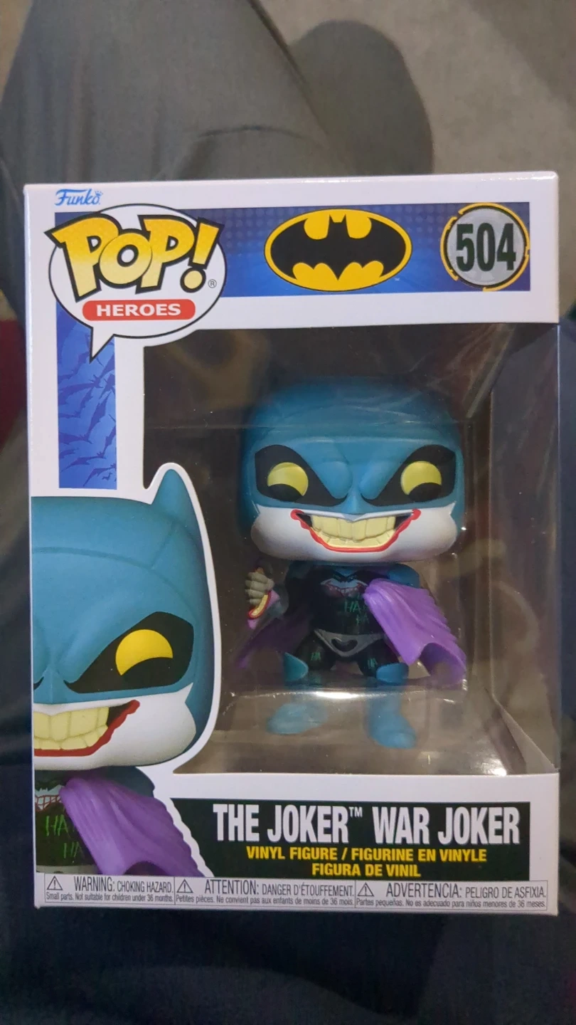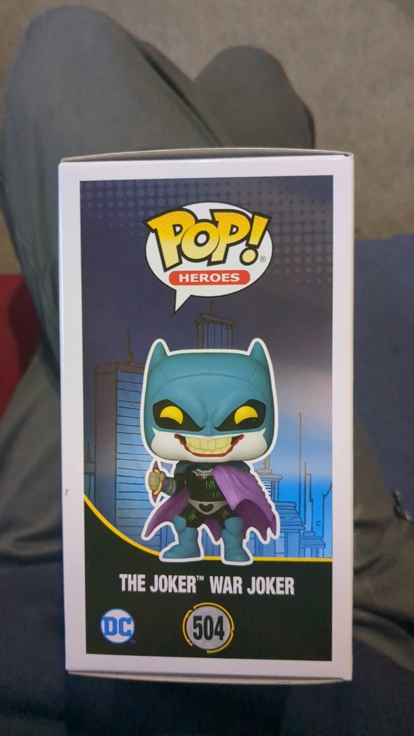 This is the Funko Pop! Heroes vinyl figure of The Joker, War Joker edition, number 504. It's part of the DC Heroes collection. The figure comes in its original box.