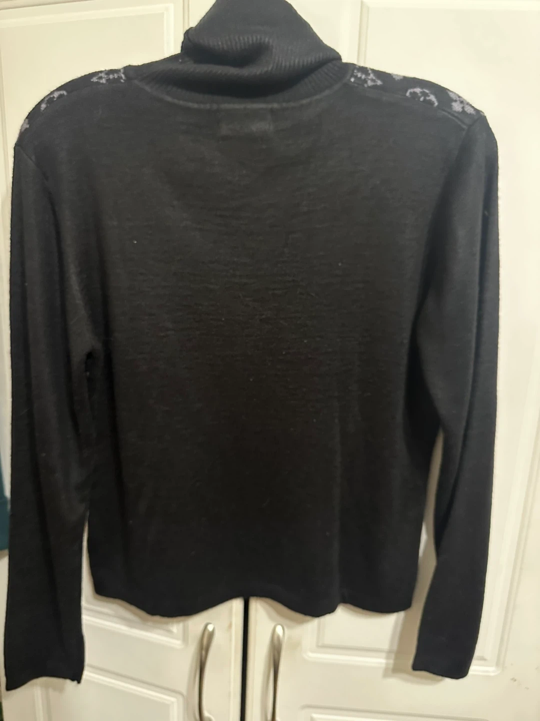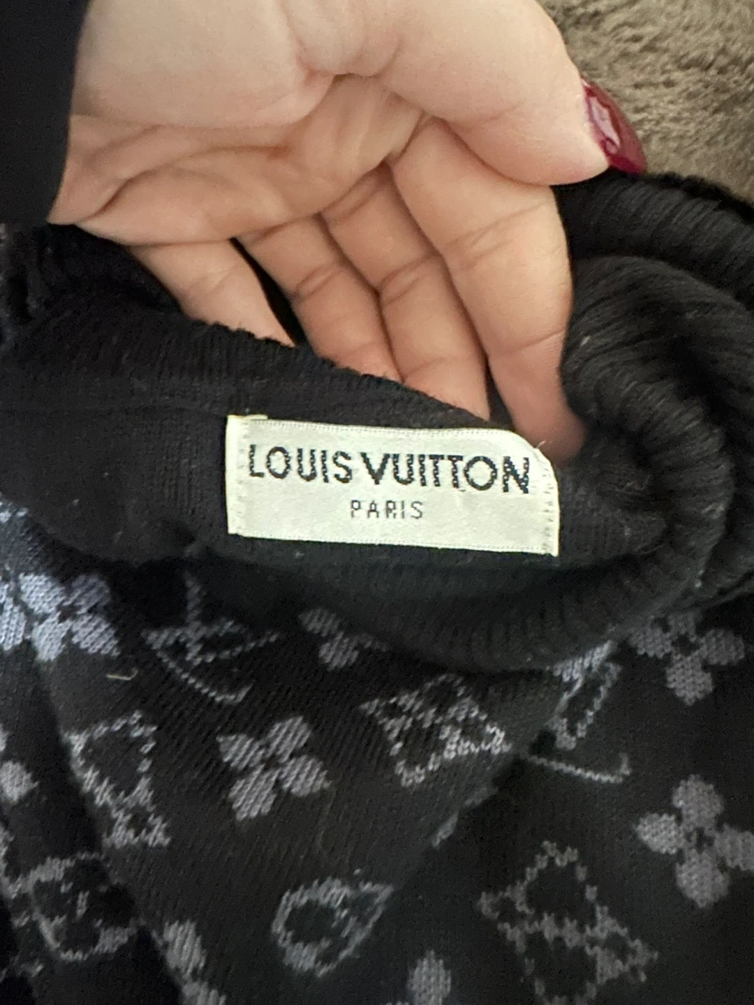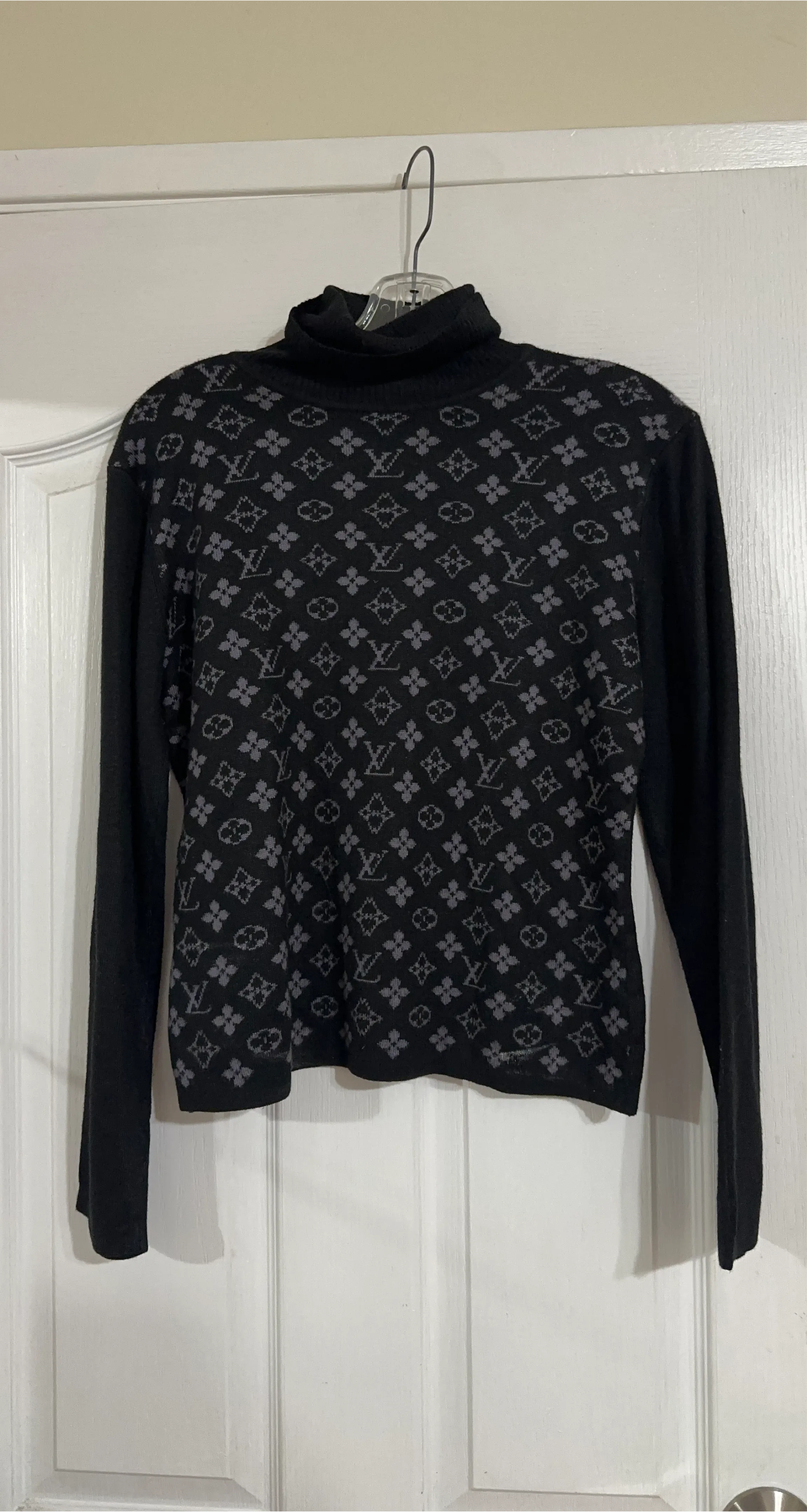 A stylish Louis Vuitton Paris turtleneck sweater. It's black with the classic LV monogram pattern in grey. Made for a comfortable fit. Size medium
