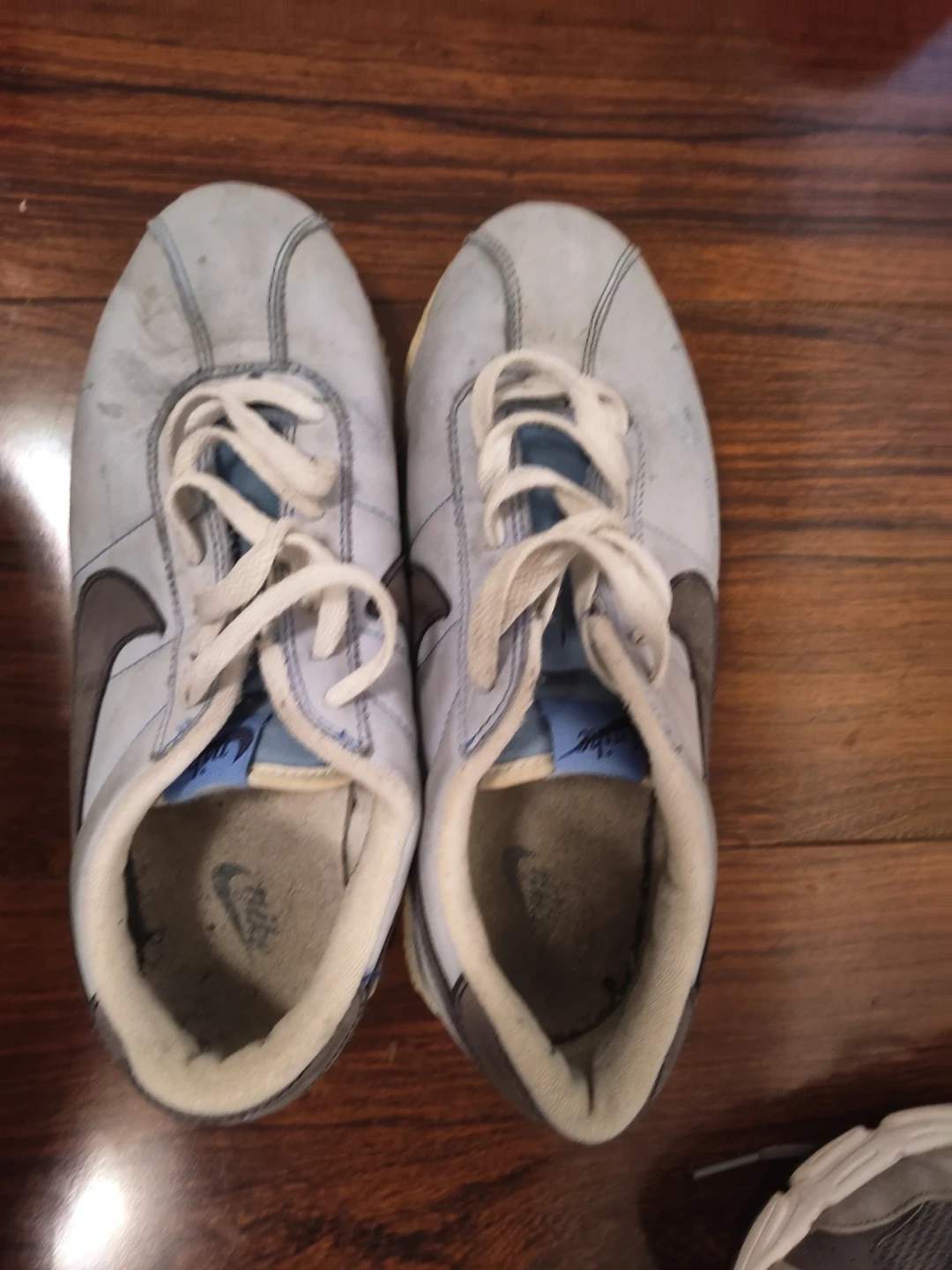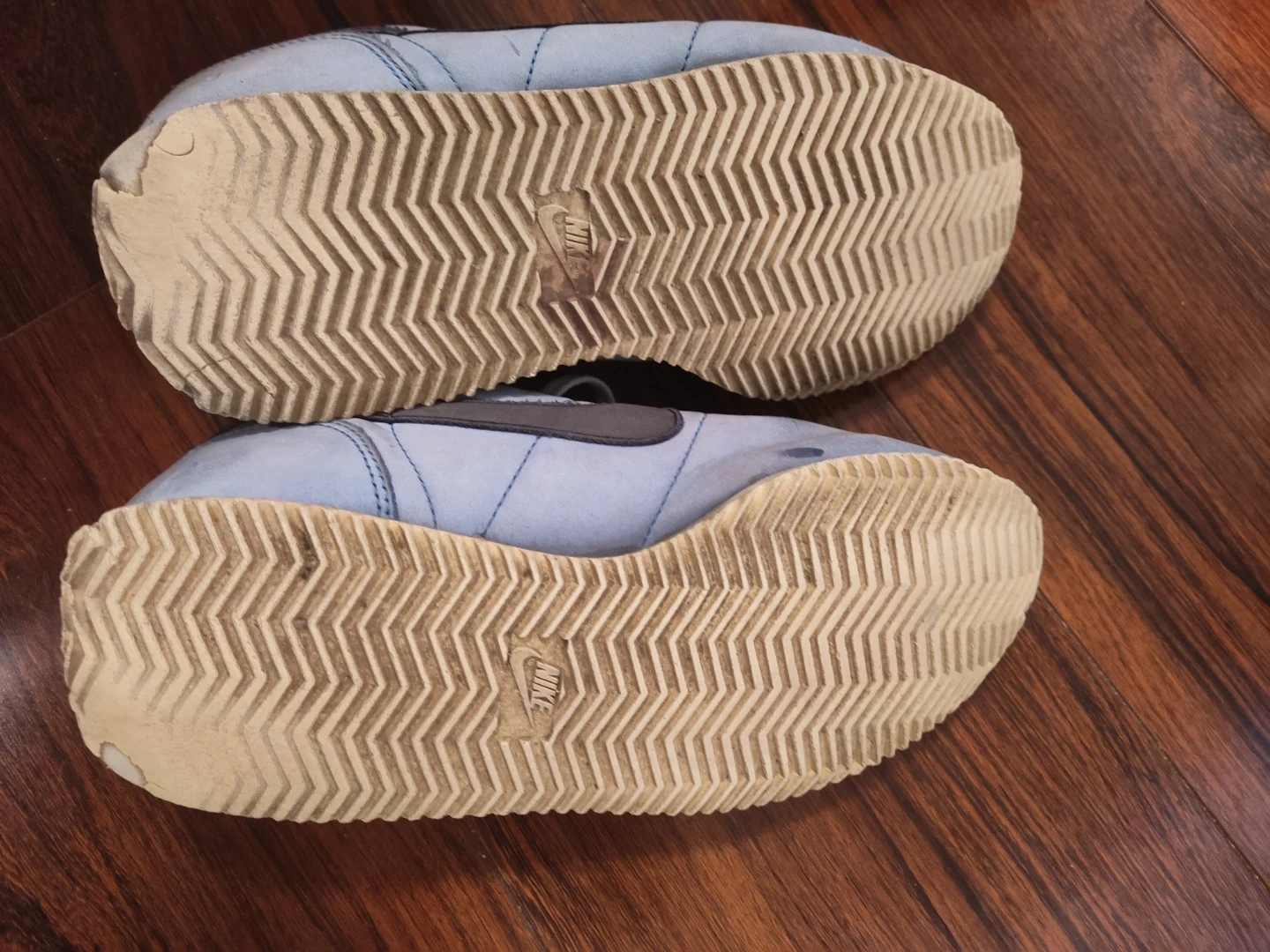 These are a pair of light blue Nike Cortez athletic shoes. 9.5 men's
