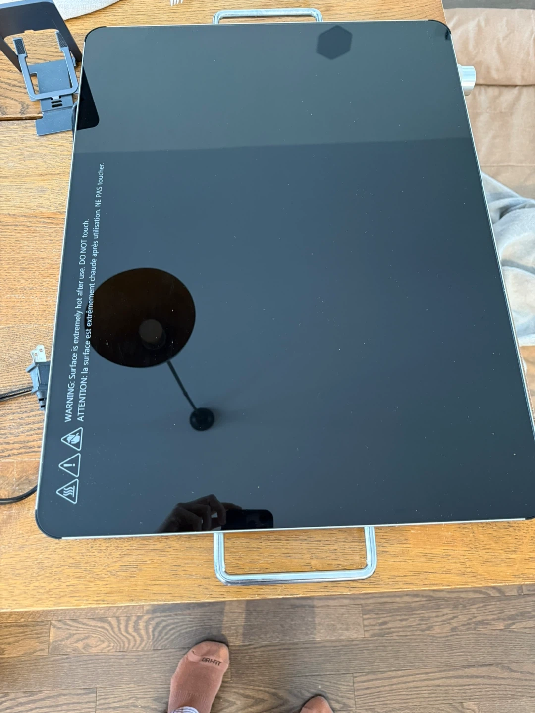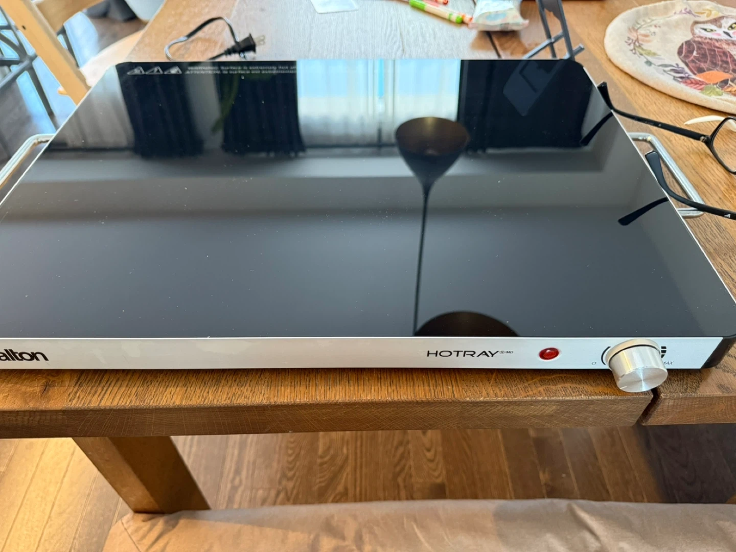 This Salton Hotray keeps your food warm. It features a smooth, black glass surface and a simple dial control for temperature. Perfect for keeping dishes warm during meals!