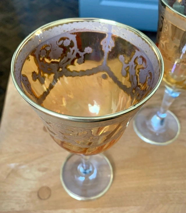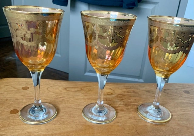 Add a touch of vintage elegance to your table with these stunning J Preziosi amber glass goblets, each adorned with a delicate 24K gold overlay. These used goblets feature a beautiful amber hue that catches the light, making them perfect for special occasions or adding a luxurious feel to everyday dining. Elegant amber colour, 24K gold overlay design. Perfect for adding a vintage touch to your dining experience. If the ad is up, they're available!