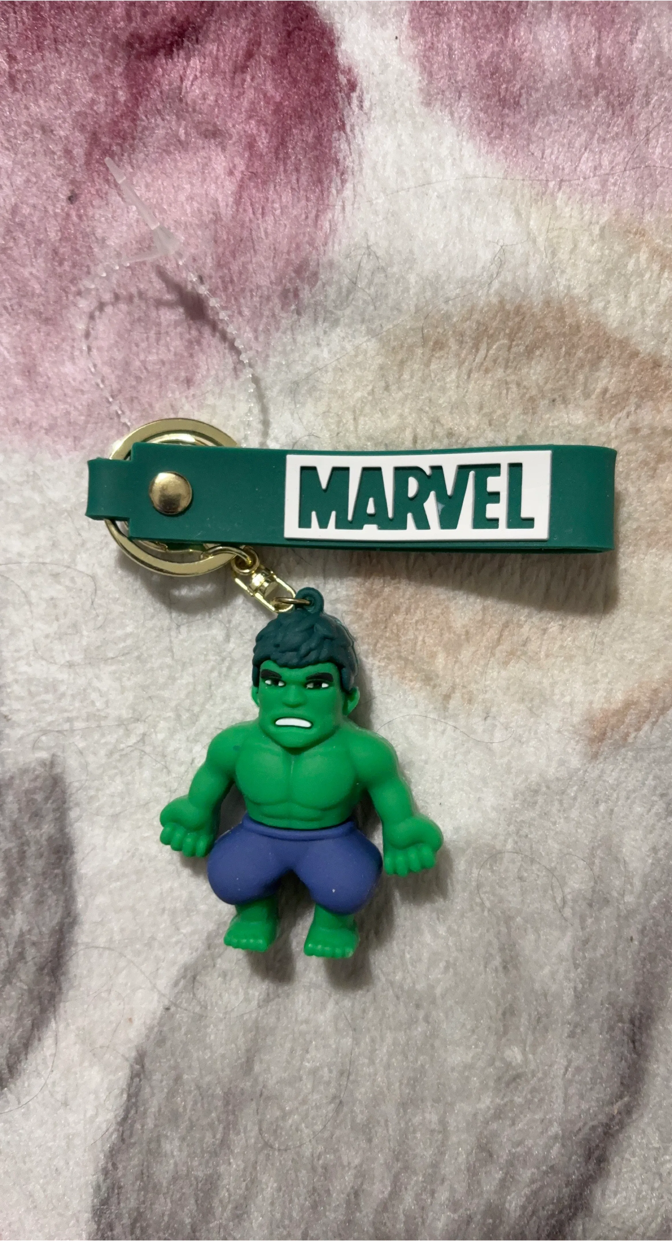 This is a Marvel Hulk keychain. It features a green rubber Hulk figure with a dark green strap and gold hardware. It's a fun accessory for any Marvel fan's keys or bag! Price is firm.