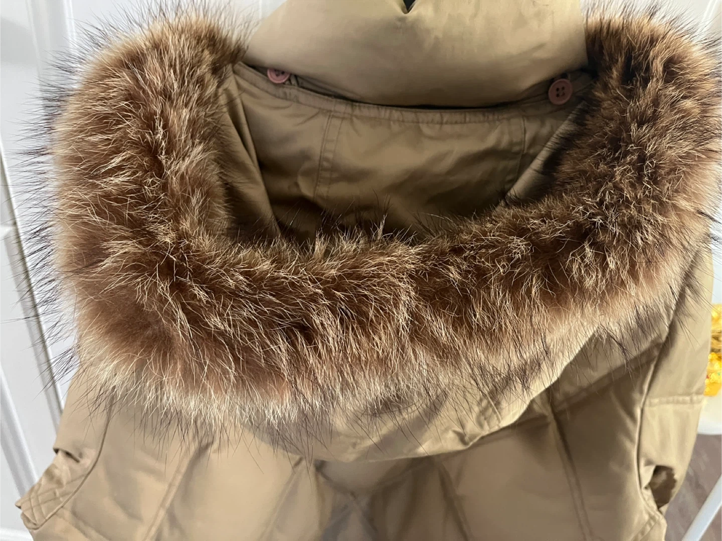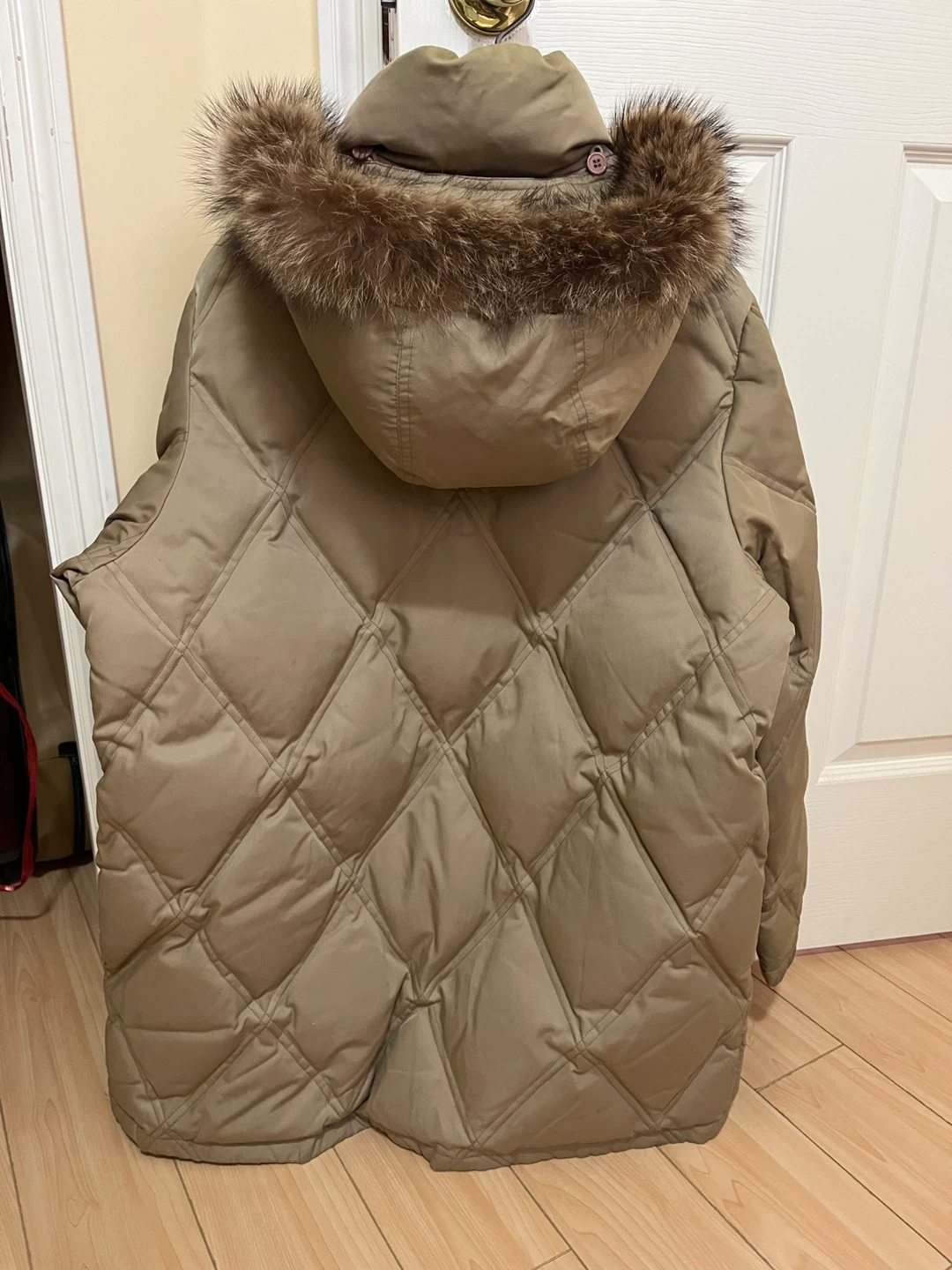 This Utex Design parka is a stylish and warm quilted jacket. It features a detachable fur-trimmed hood and multiple pockets. The size is M/M. Long 34”, shoulder 18”, sleeve 24”.