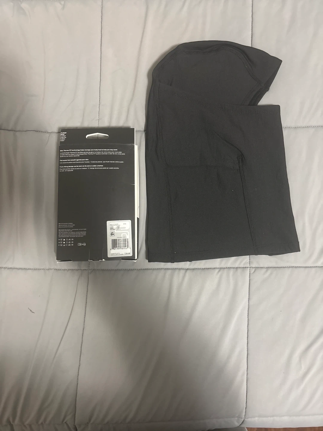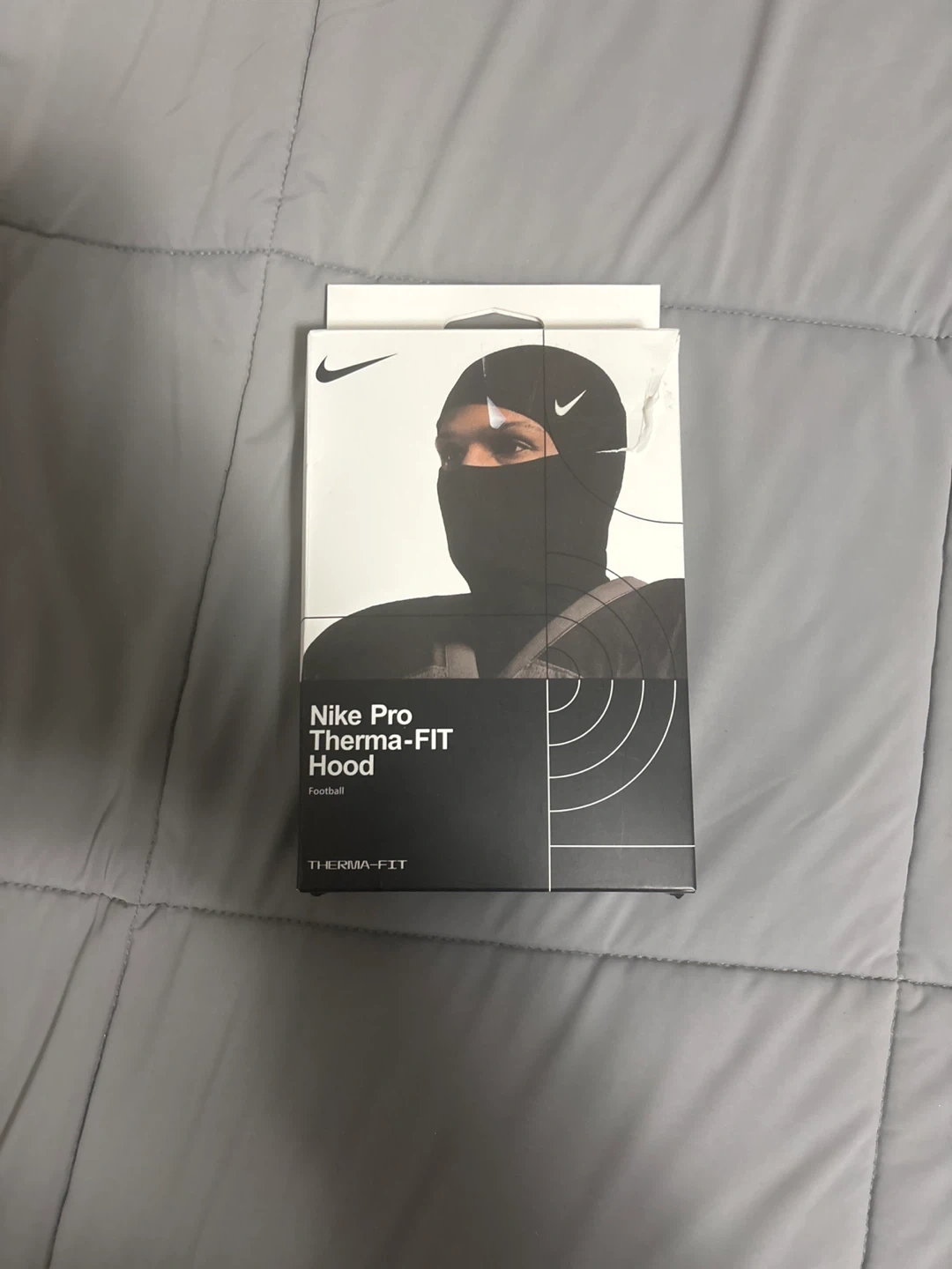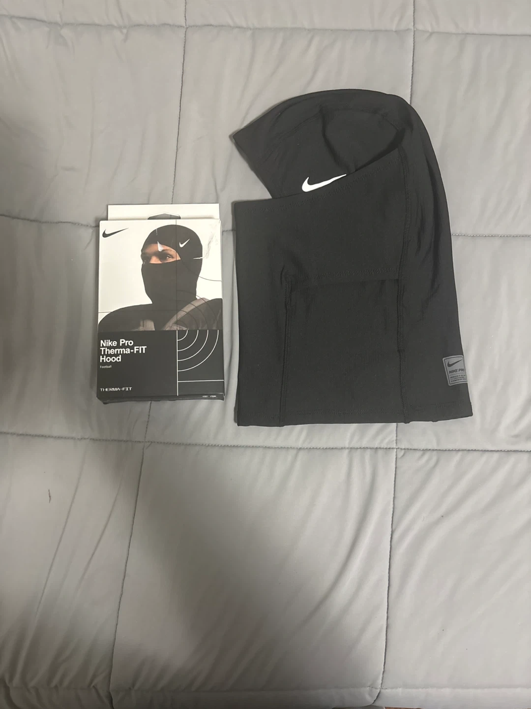 This is a black Nike Pro Therma-FIT hood, designed for football. It's made with Therma-FIT technology to help keep you warm. The hood is a one-size-fits-all design.