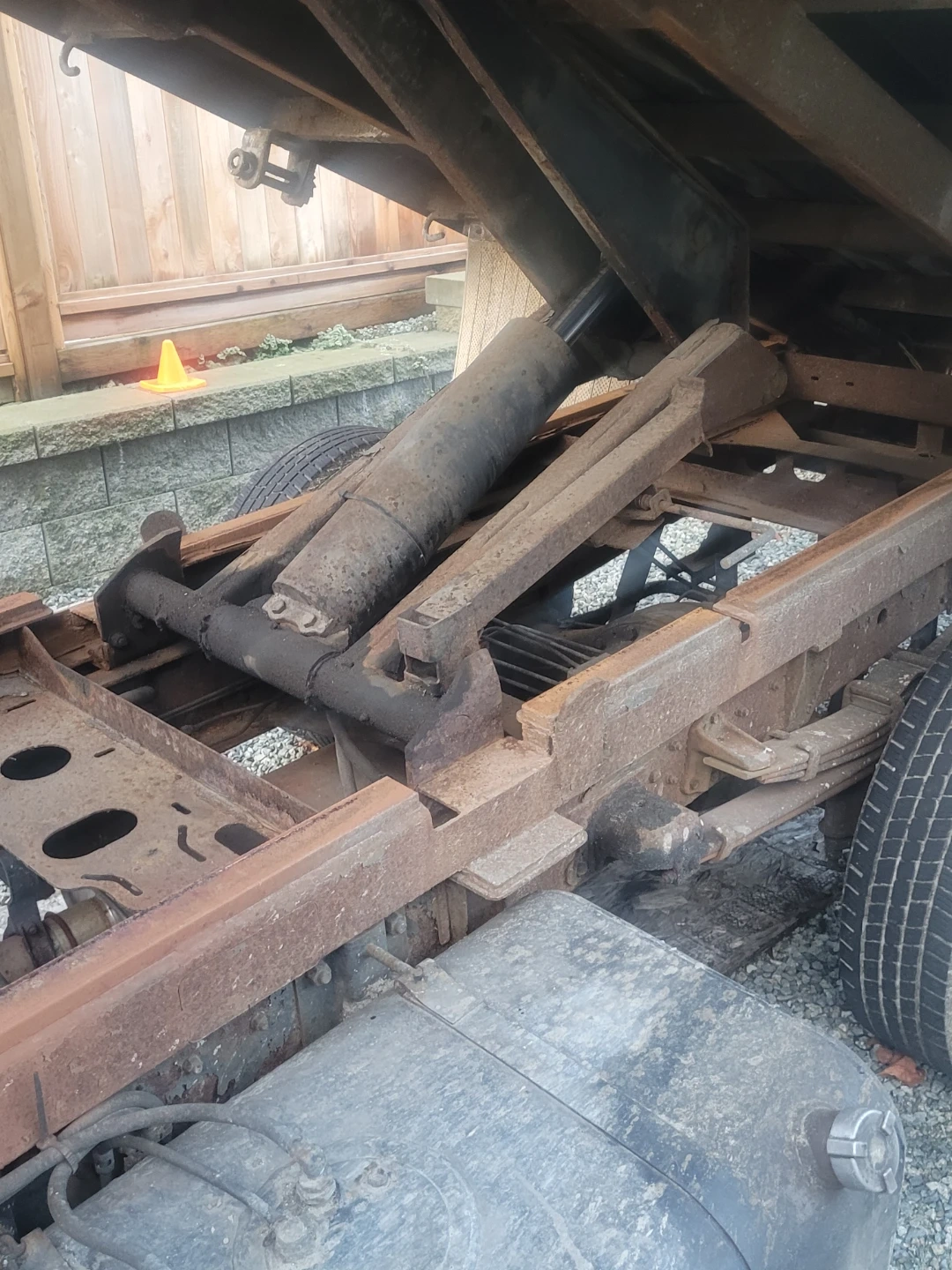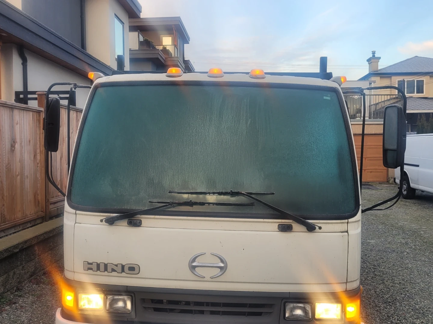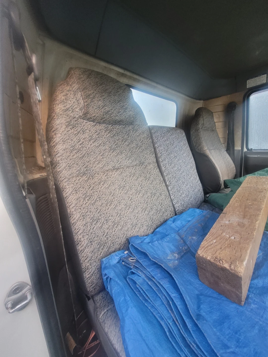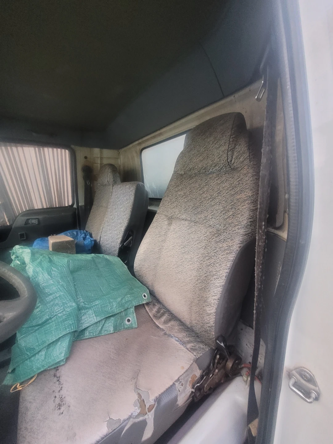 This is a 2001Hino FA 1517 dump truck, great for hauling. It has a functional hydraulic lift system and shows 243000 miles on the odometer. The interior features two seats.