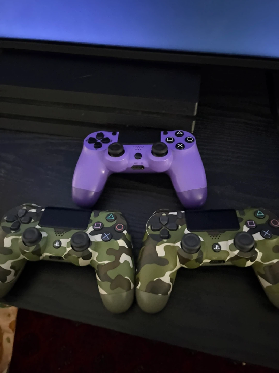 Three controllers for your PlayStation 4 console: one purple and two camouflage. They're ready for multiplayer gaming sessions