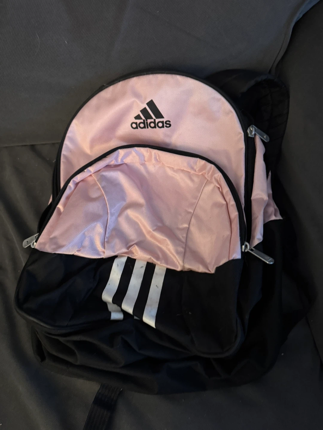 Pink and black Adidas backpack with white stripes. It features multiple zippered compartments. This bag's adjustable straps make it comfy to wear.