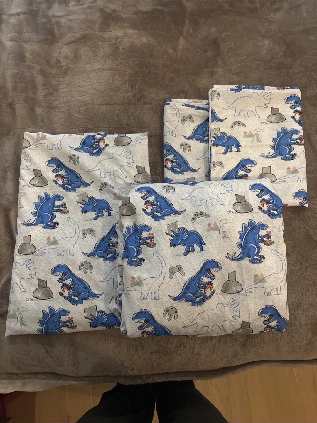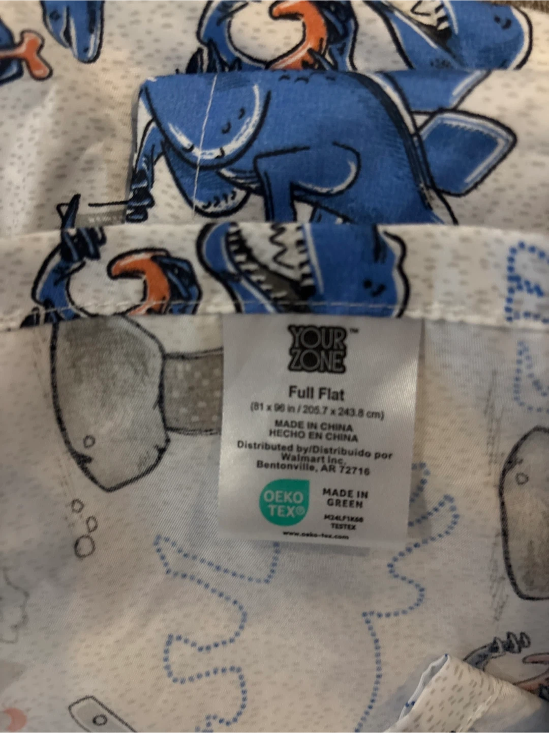 This is a full flat sheet set from Your Zone. It features a fun dinosaur print with gaming controllers. The dimensions are 81 x 96 inches (205.7 x 243.8 cm).