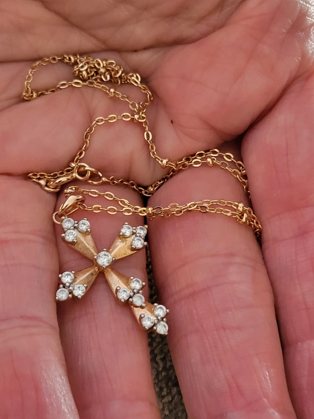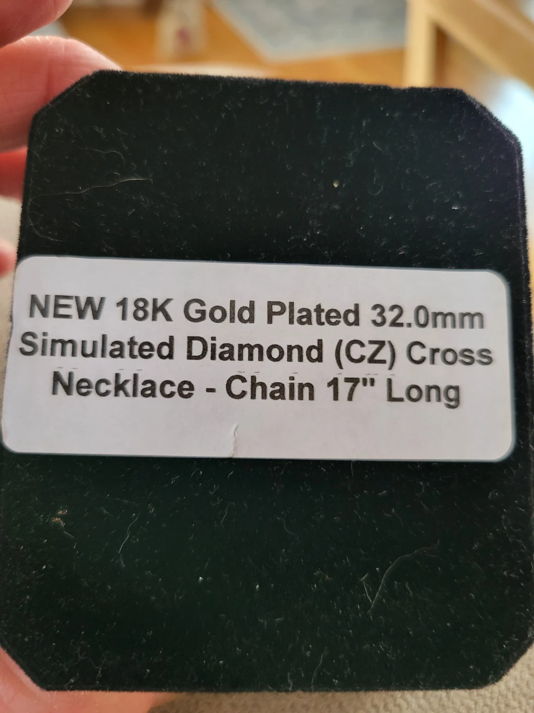 18K Gold Plated 32mm cross pendant necklace with Cubic Zirconia stones. It's 17 inches long. A lovely piece for everyday wear or special occasions!