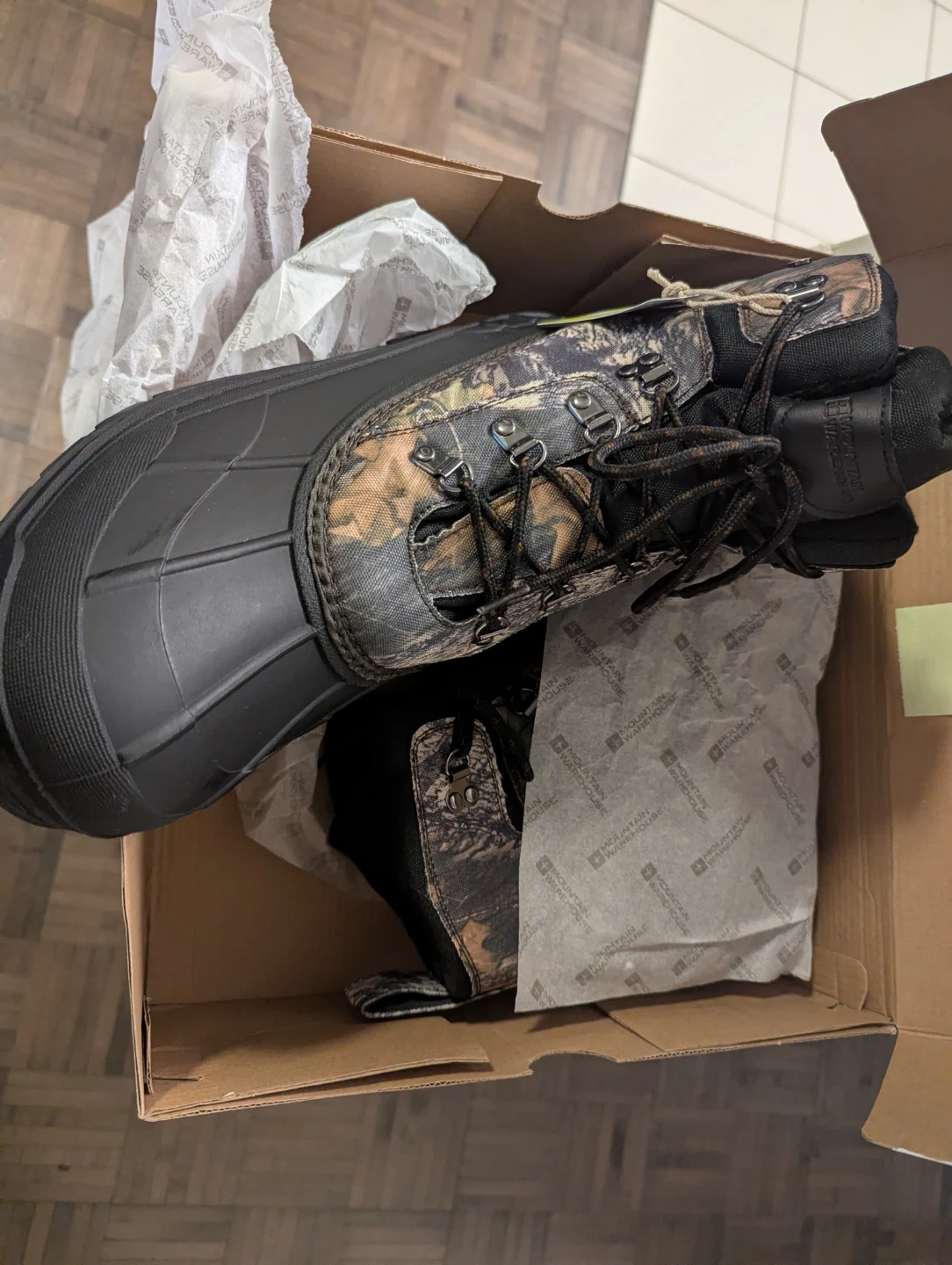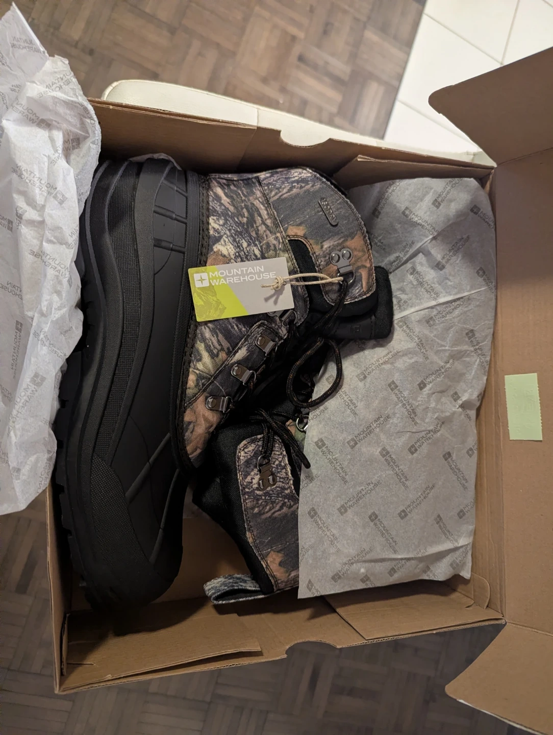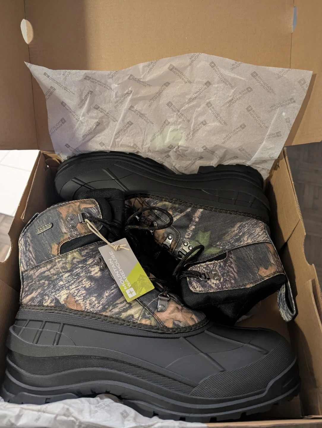 Brand new Mountain Warehouse winter boots in a camouflage pattern. Size 13 US, 12 UK, EU 46. These boots are waterproof and insulated for cold weather. Original box included.