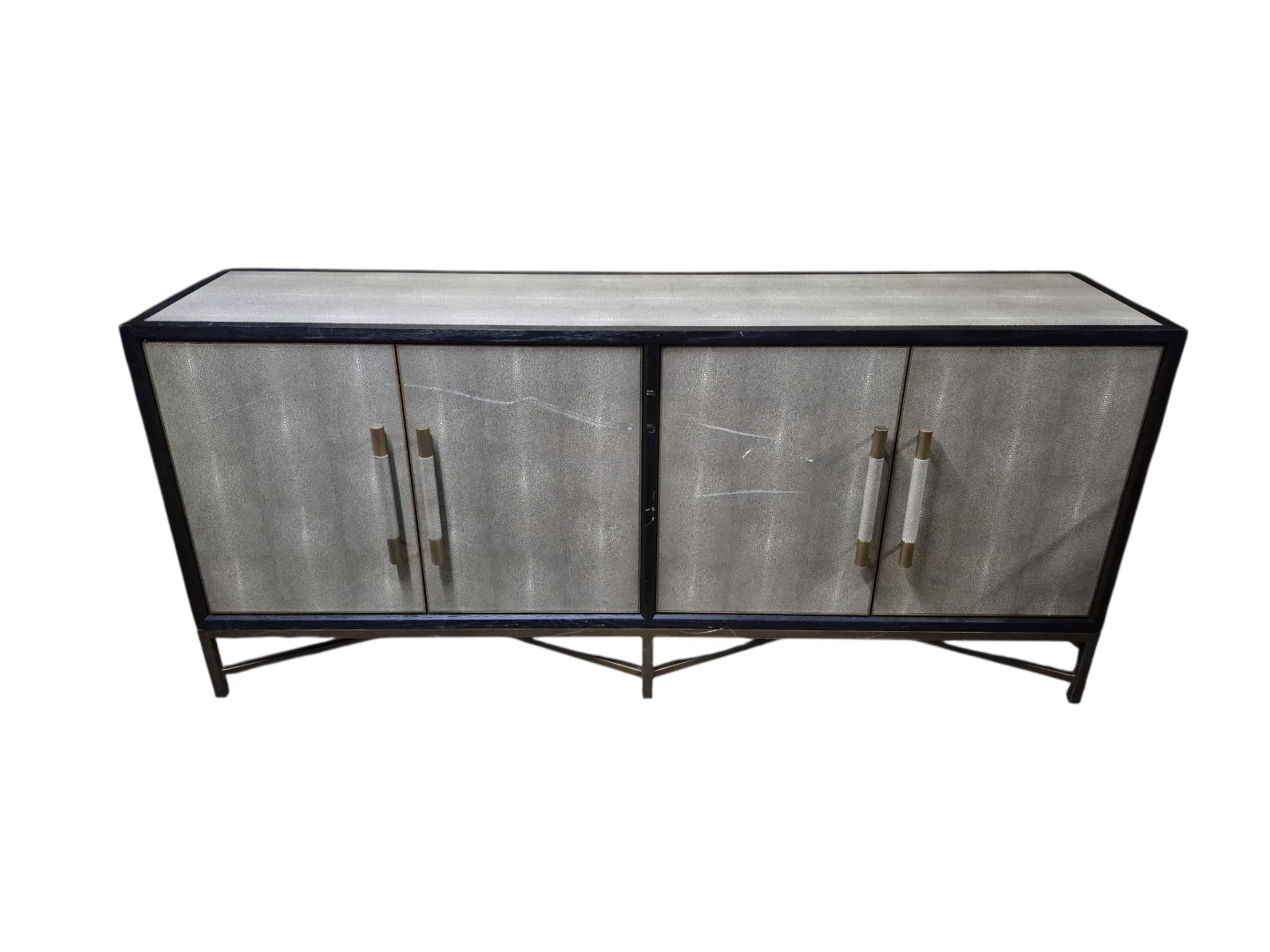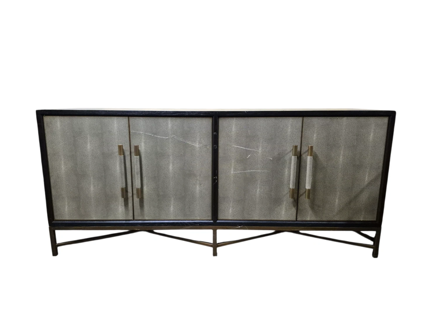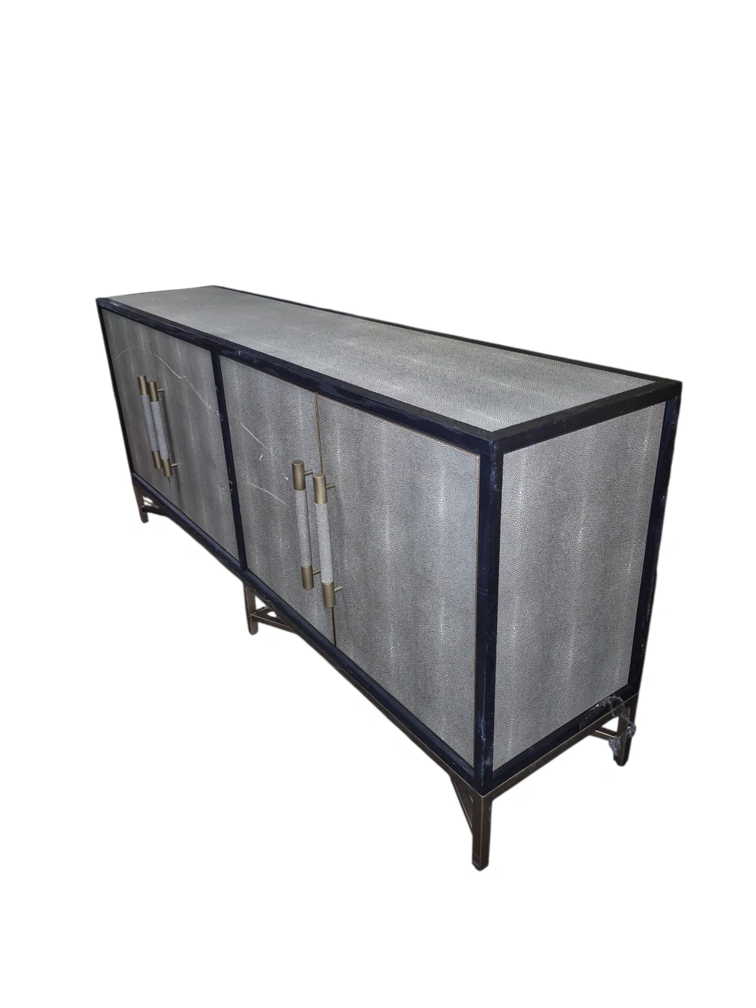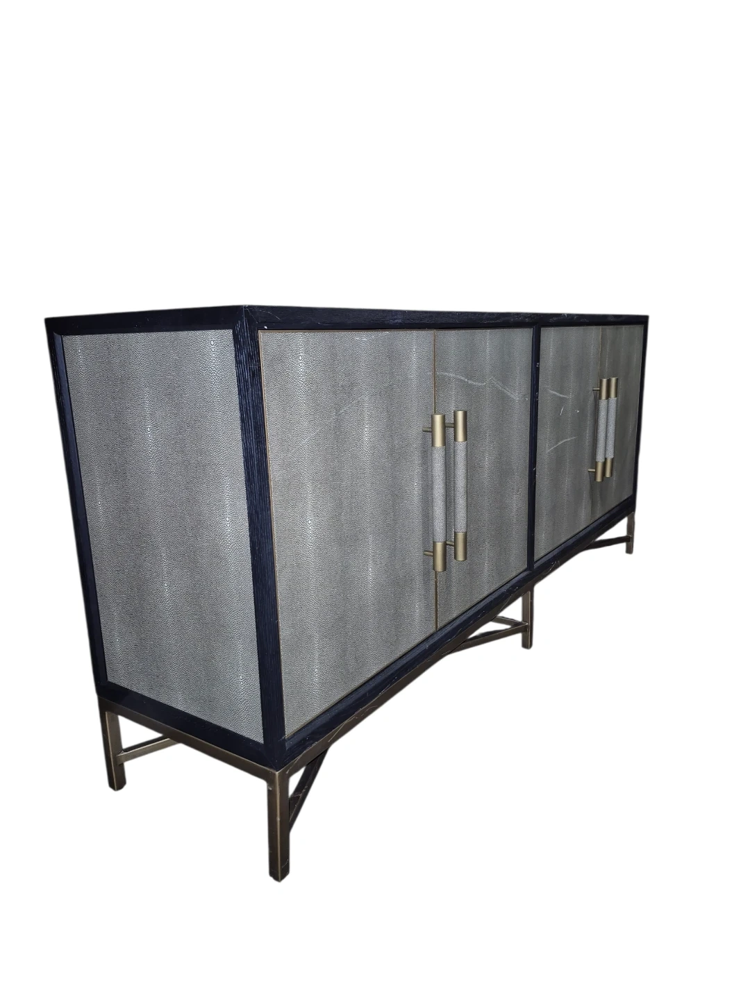 This is a Moe's Home Collection Mako Sideboard in black with a faux shagreen finish and brass hardware.
