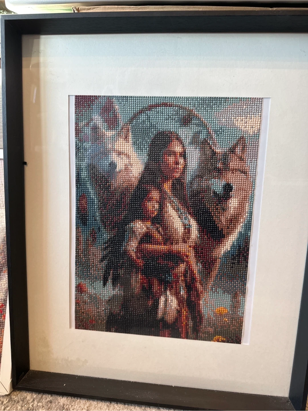 This framed diamond painting depicts a woman holding a child, with wolves surrounding them. It's a beautiful piece featuring intricate beadwork. The artwork comes in a black frame with a white mat.