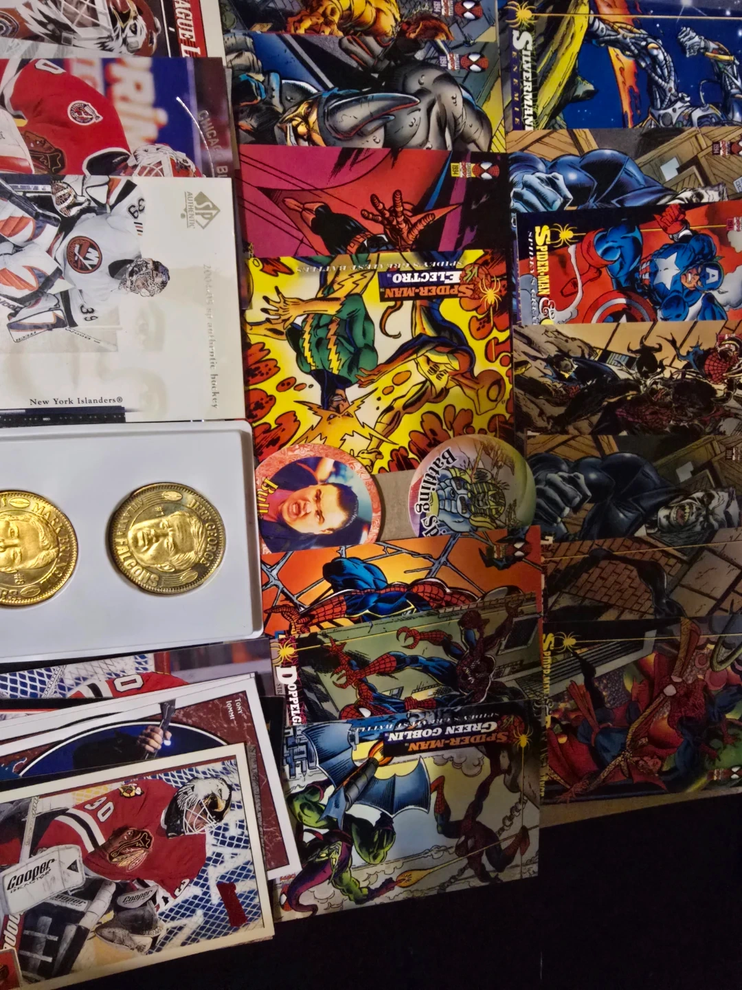 A collection of assorted Spider-Man comic trading cards featuring Electro and Green Goblin. Also includes New York Islanders and Chicago Blackhawks hockey cards.