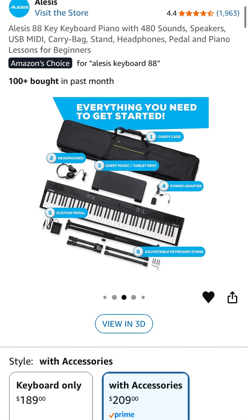 This is an Alesis 88-key digital piano with 480 sounds and built-in speakers. It includes a carry bag, sheet music stand, sustain pedal, headphones, power adapter, and an adjustable keyboard stand.