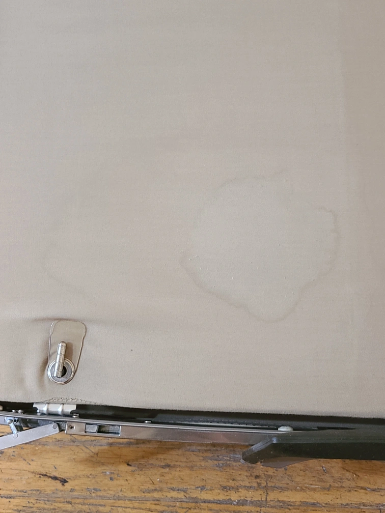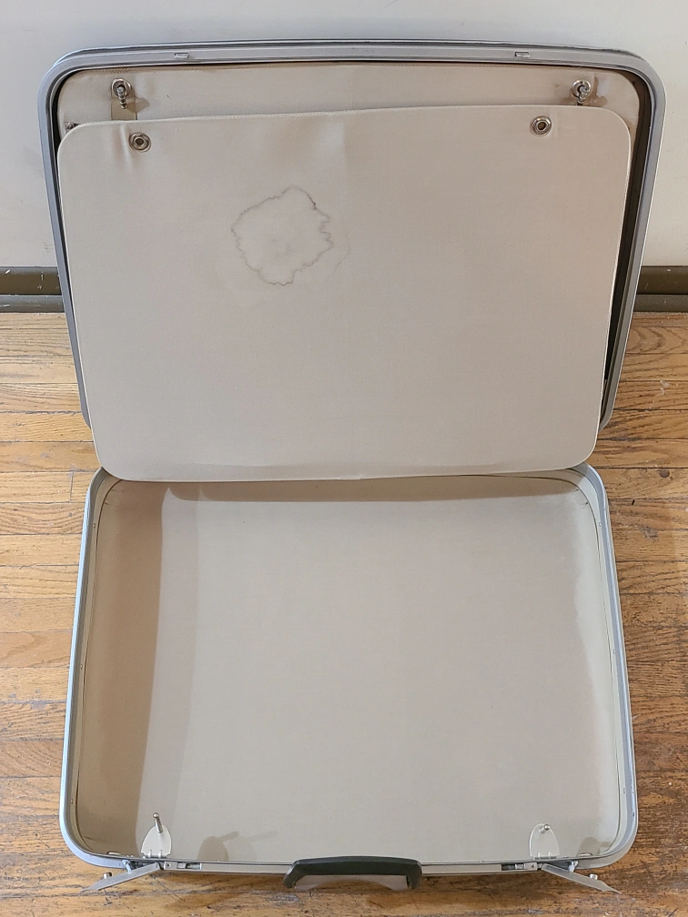 Missing keys so cannot be locked, handle is a bit sticky and slight stain on fabric on the inside fabric but should be cleanable.