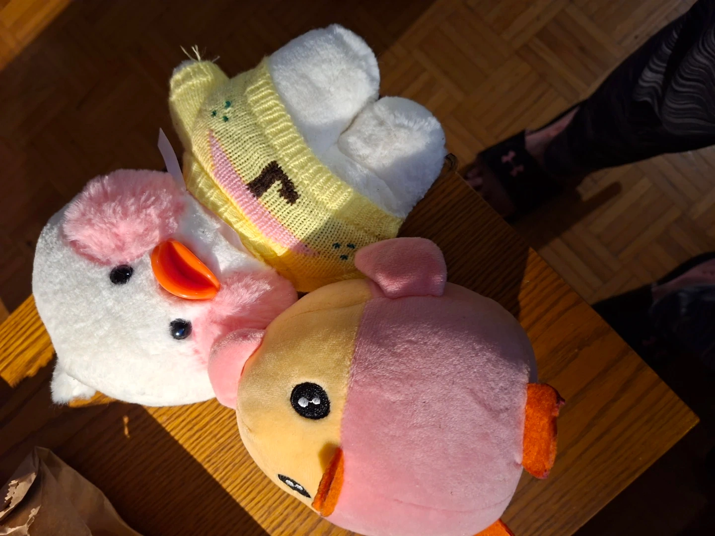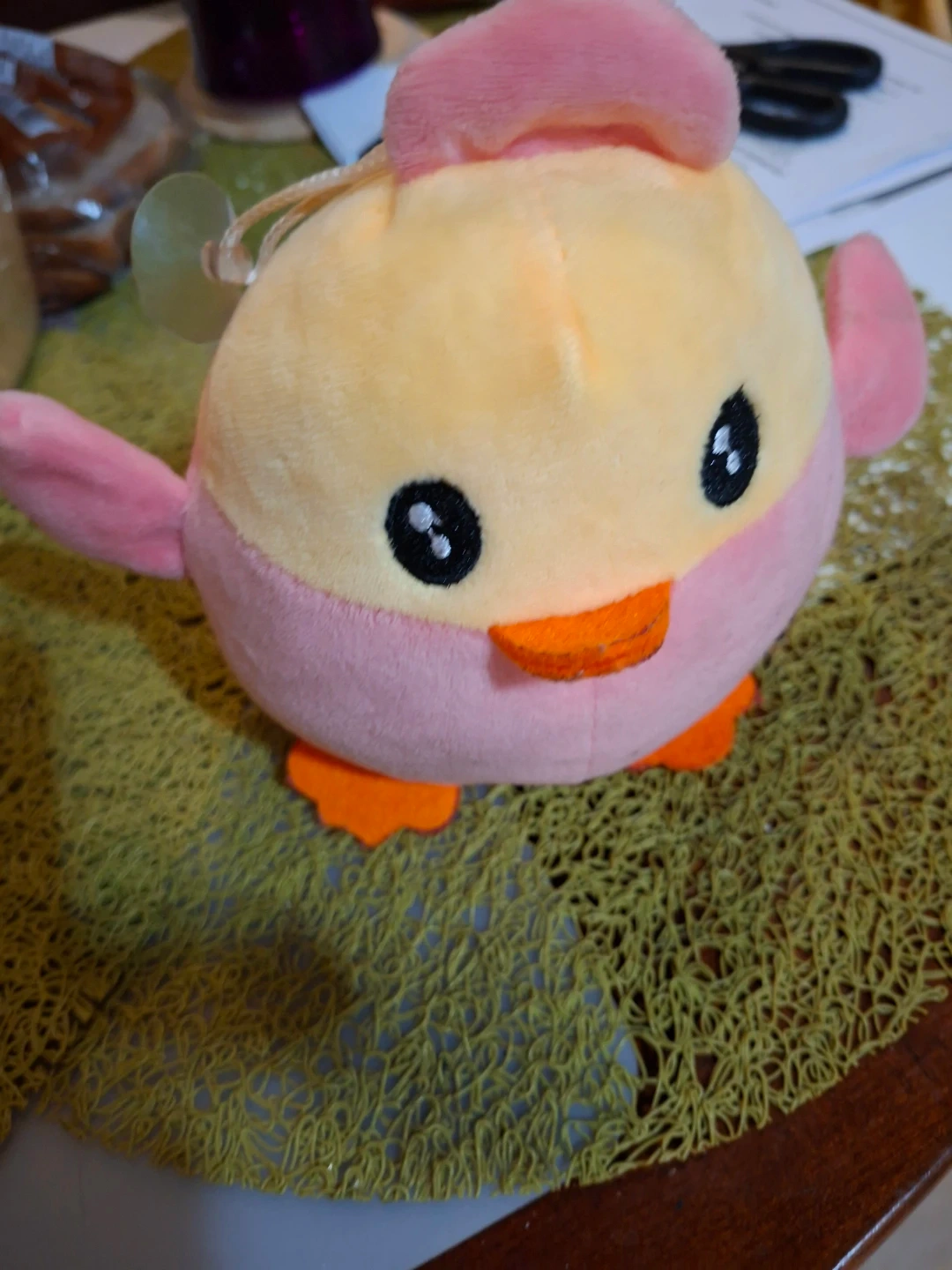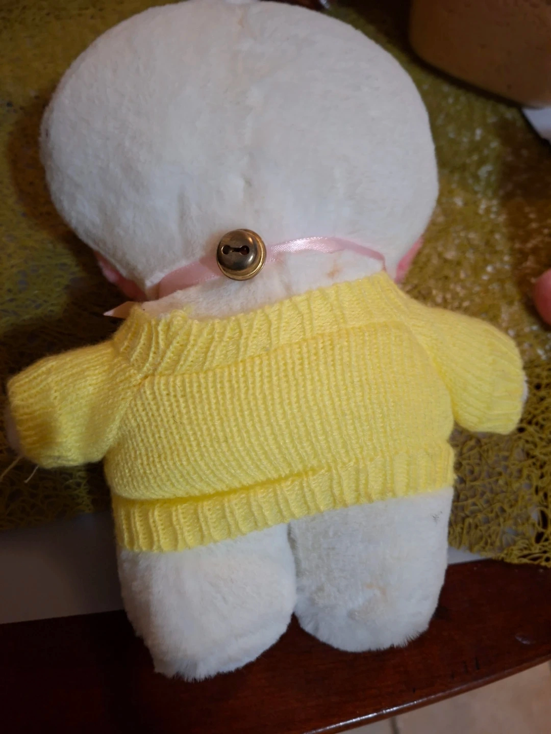 Soft white plush duck toy wearing a yellow knitted sweater. It has pink fuzzy cheeks and an orange beak. This toy would be a great companion for a child!