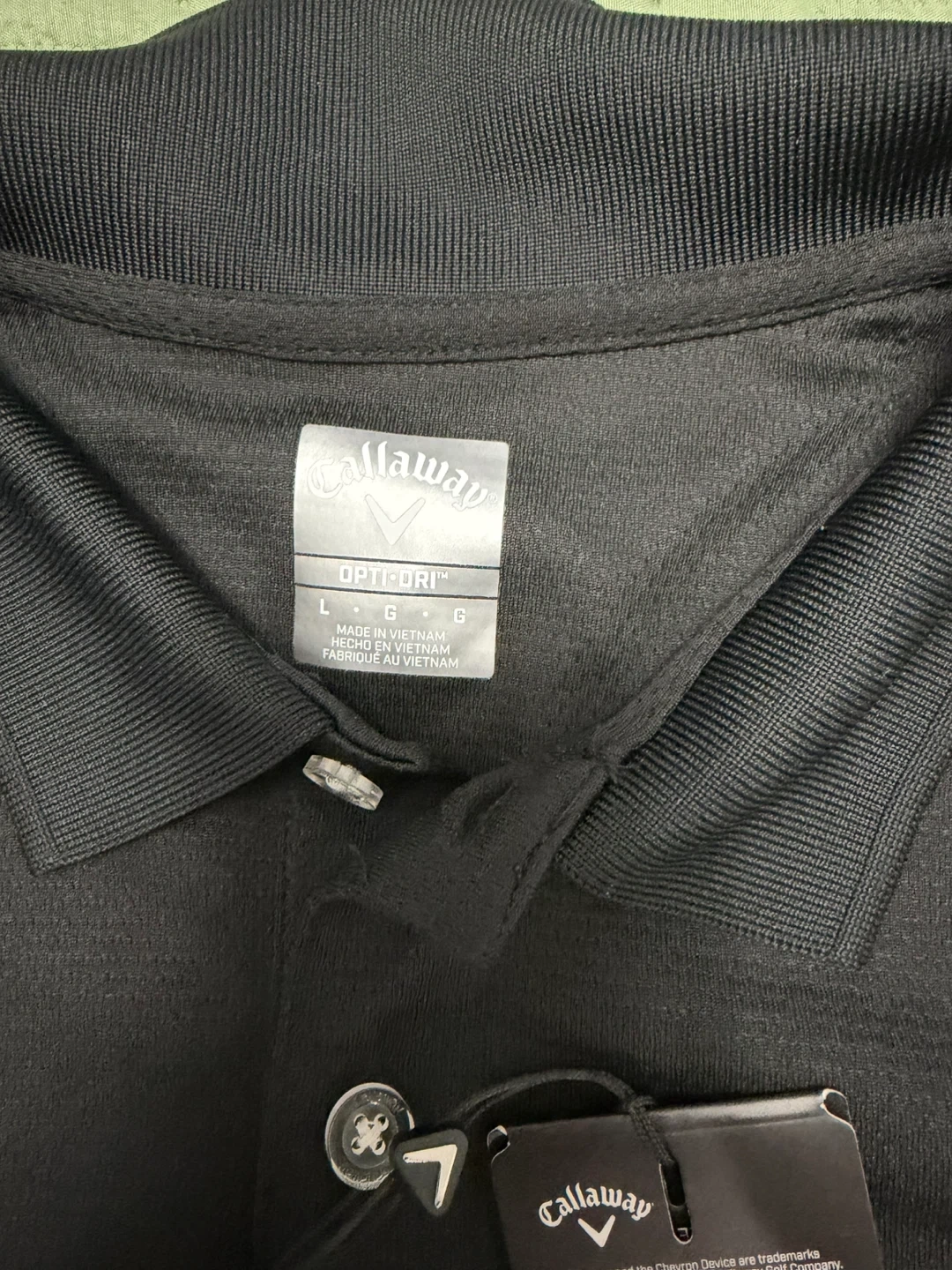 This is a Callaway Opti-Dri golf polo shirt in black. It's a size L. The fabric is designed for performance.