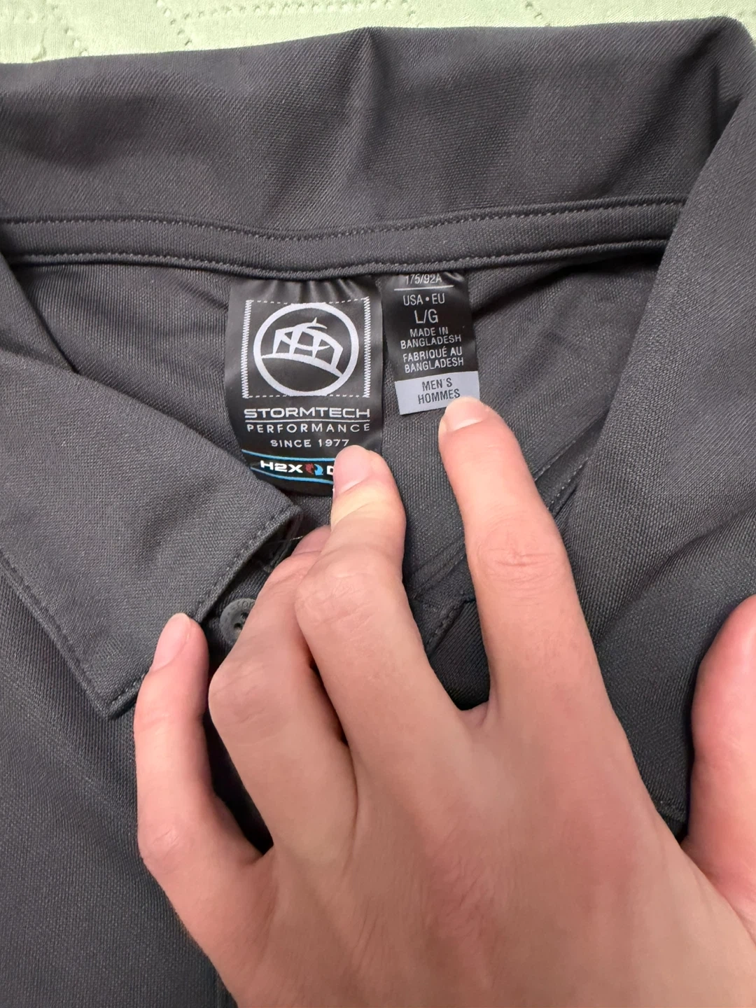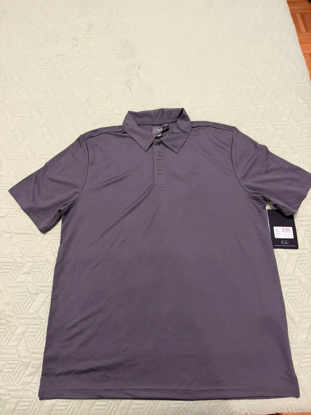 This is a Stormtech Performance polo shirt in grey. It's a size XL for men. The shirt is made from a performance fabric.