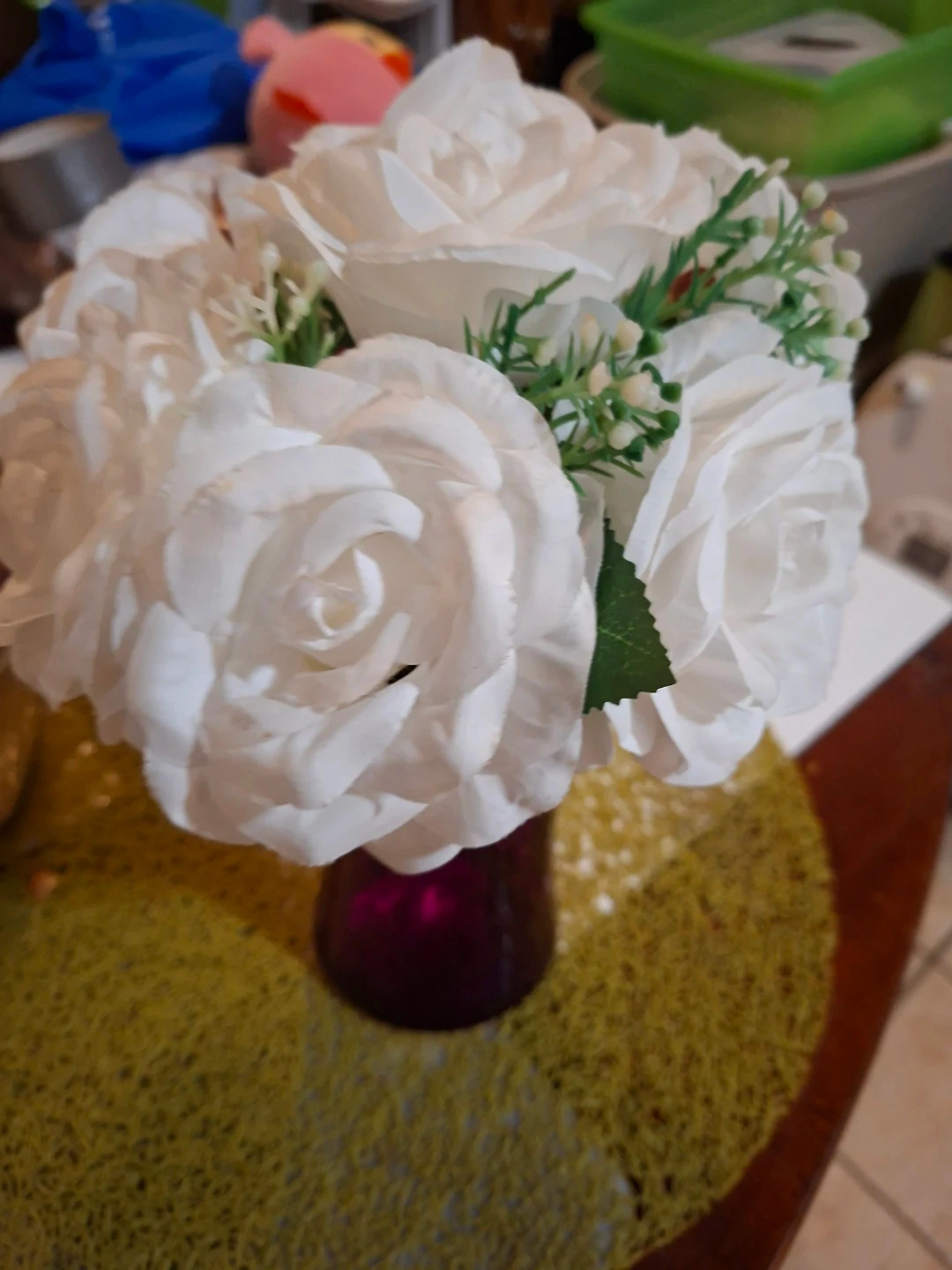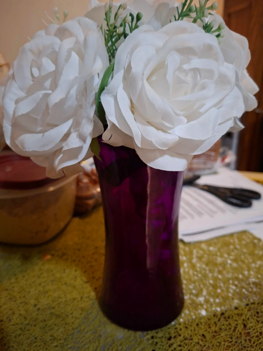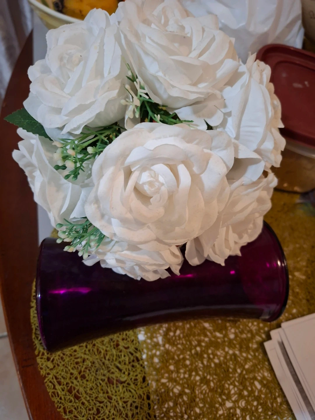 A lovely arrangement of white artificial roses in a vibrant purple glass vase. It's about 10 inches tall. This piece adds a touch of elegance to any room without any upkeep. It's perfect for display on a table or shelf.