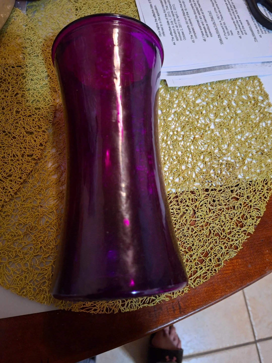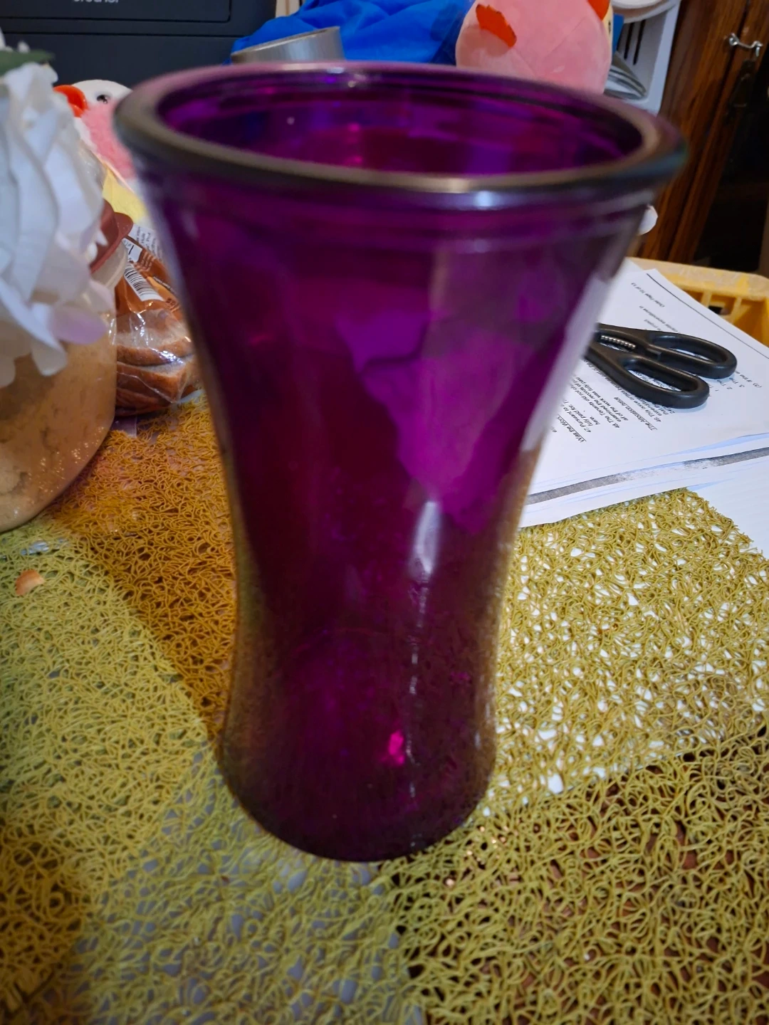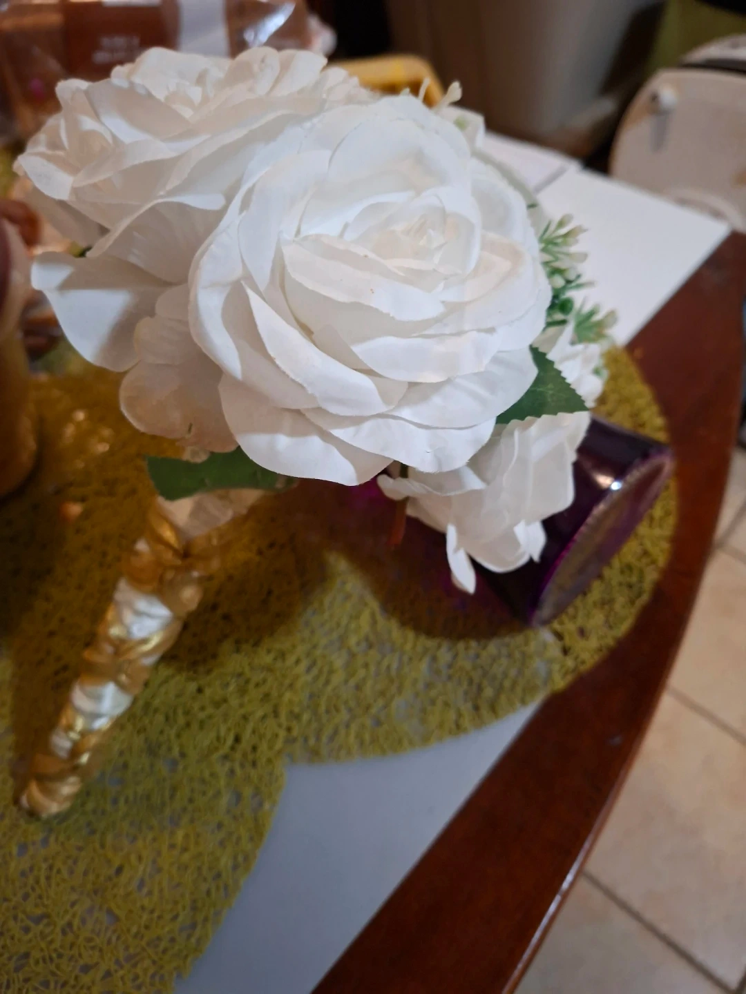 A lovely arrangement of white artificial roses in a vibrant purple glass vase. It's about 10 inches tall. This piece adds a touch of elegance to any room without any upkeep. It's perfect for display on a table or shelf.