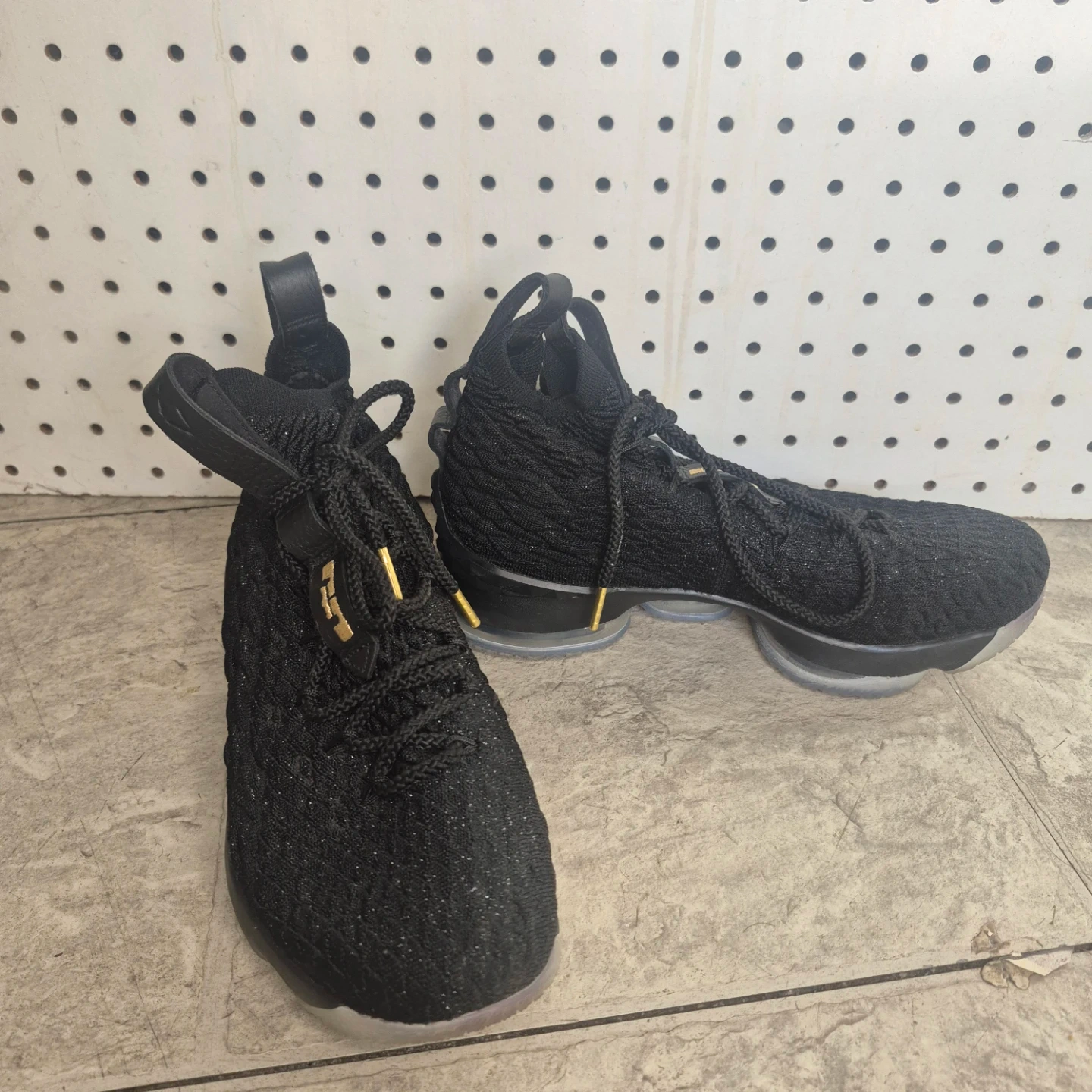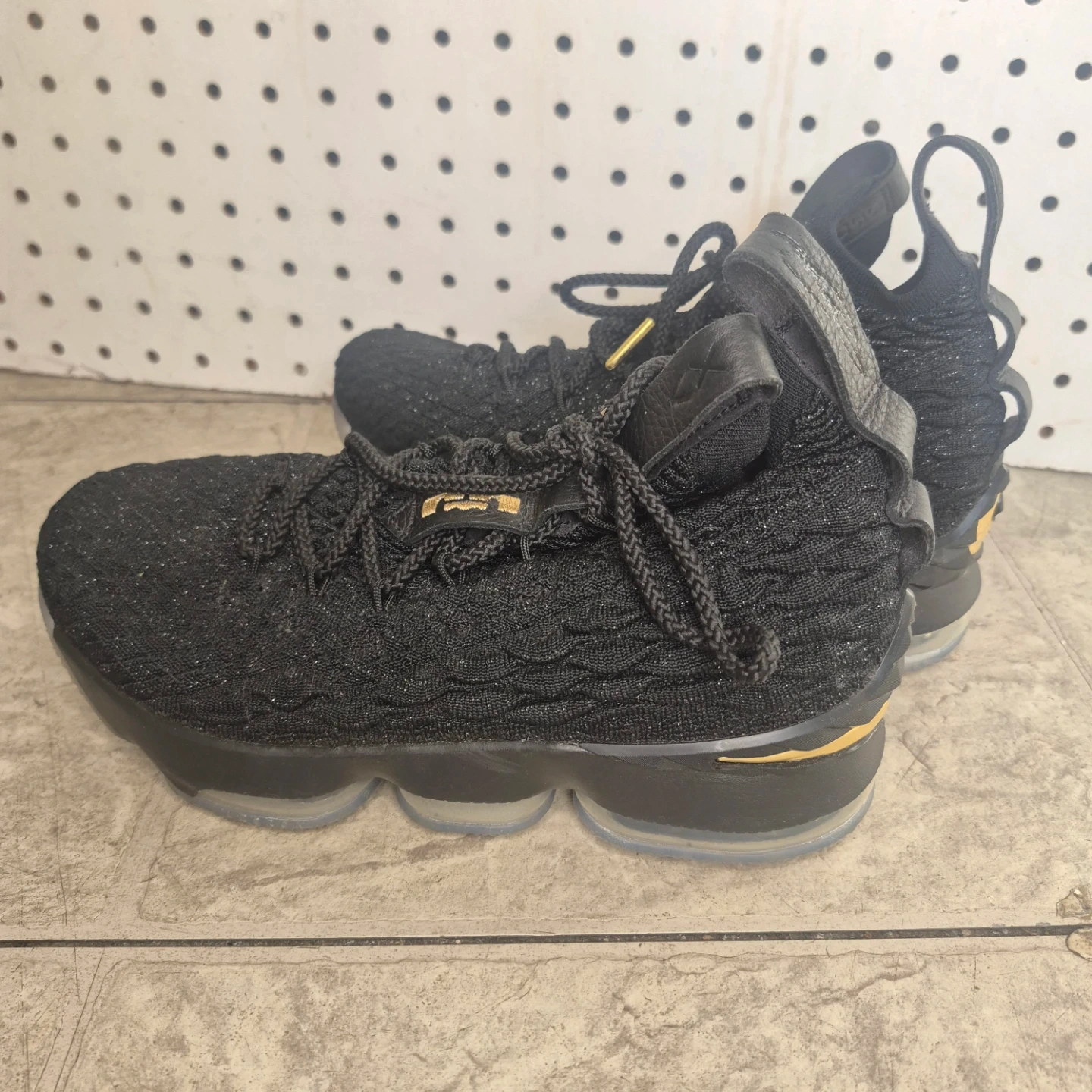 Nike LeBron 15 basketball shoes in black and gold. Knit upper with lace-up closure. Features a visible Air Max unit in the sole for cushioning. Great for the court!