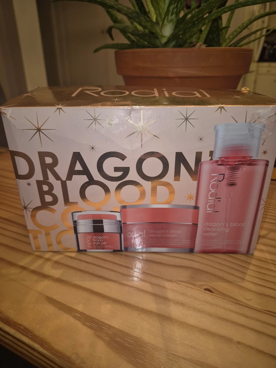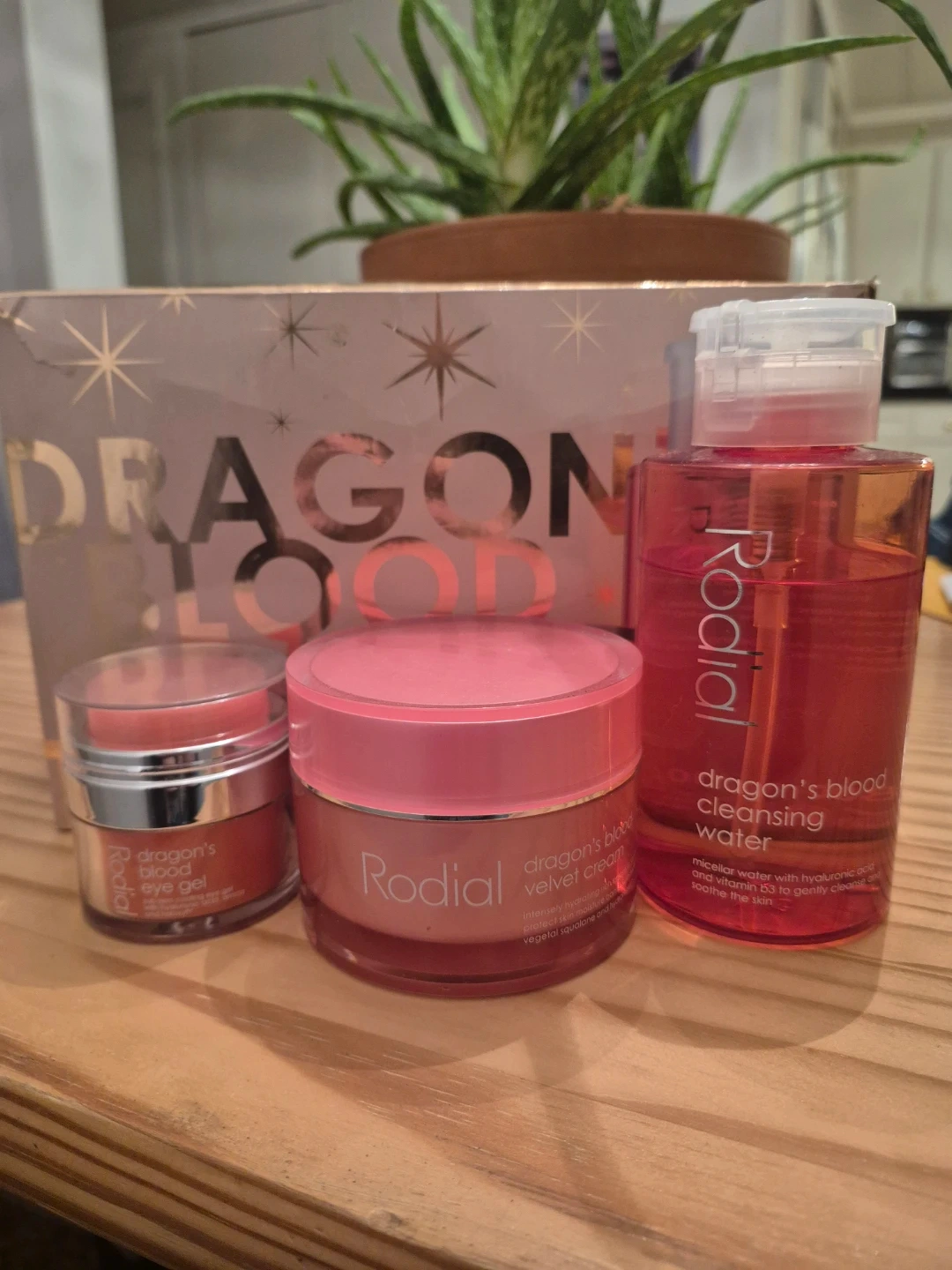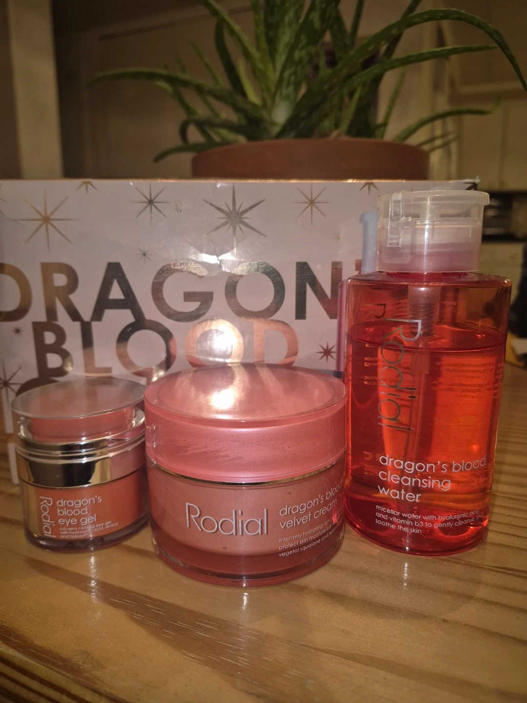 This Rodial Dragon's Blood set includes a cleansing water, eye gel, and velvet cream. The cleansing water is micellar based with hyaluronic acid and rose water to soothe skin. It's great for intense hydration.