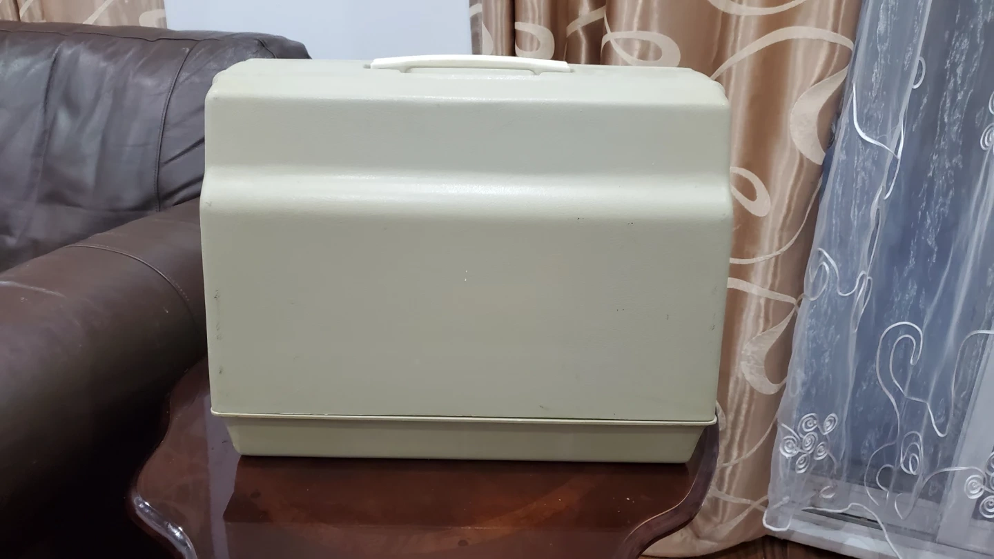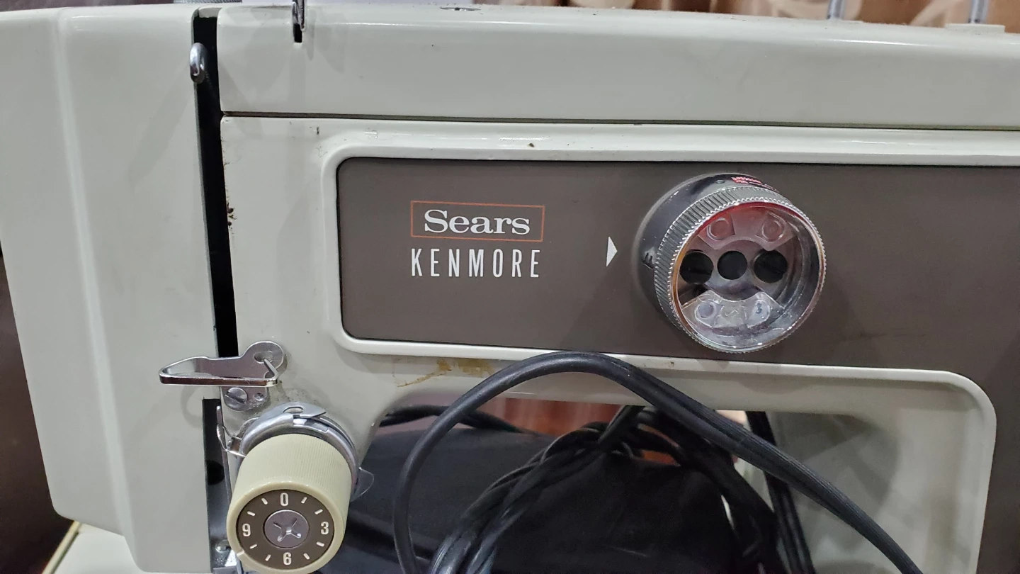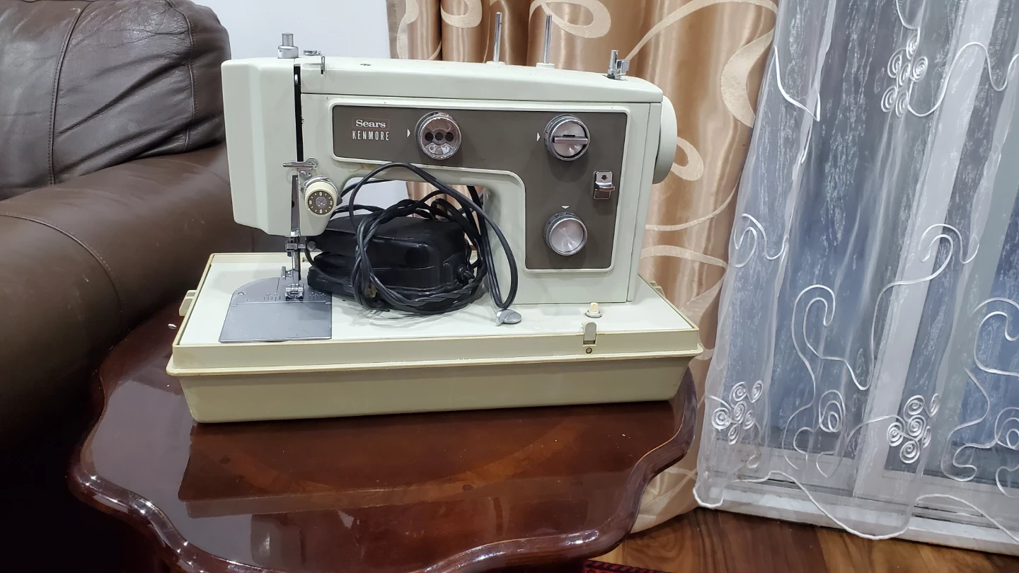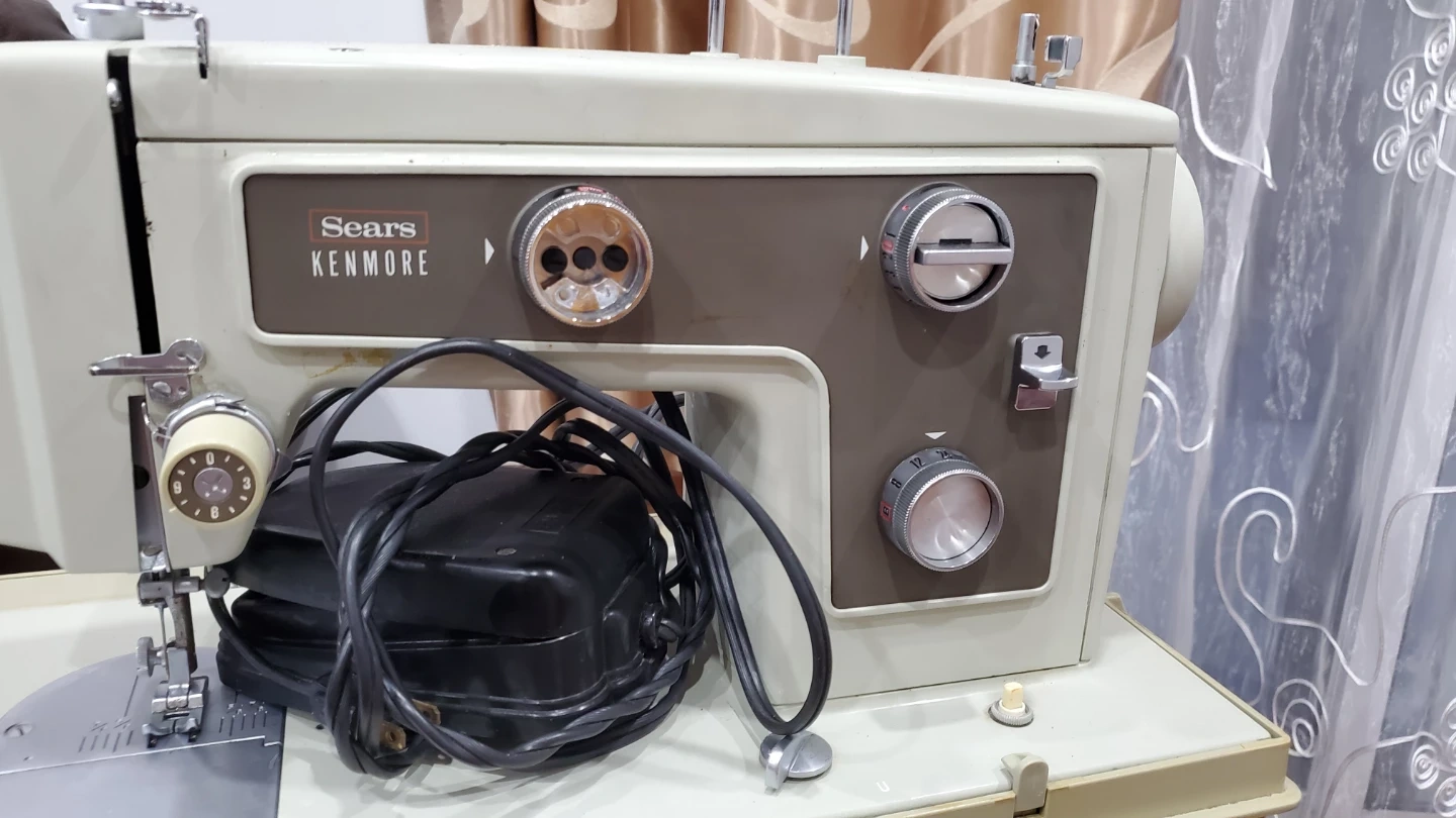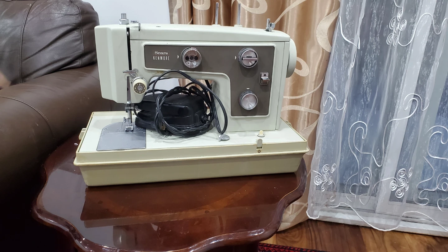 This is a vintage Sears Kenmore sewing machine, complete with its original carrying case and foot pedal. It's a classic beige colour, ready for your sewing projects. The machine includes the power cord and foot control. It's great for simple repairs or new garment creation!