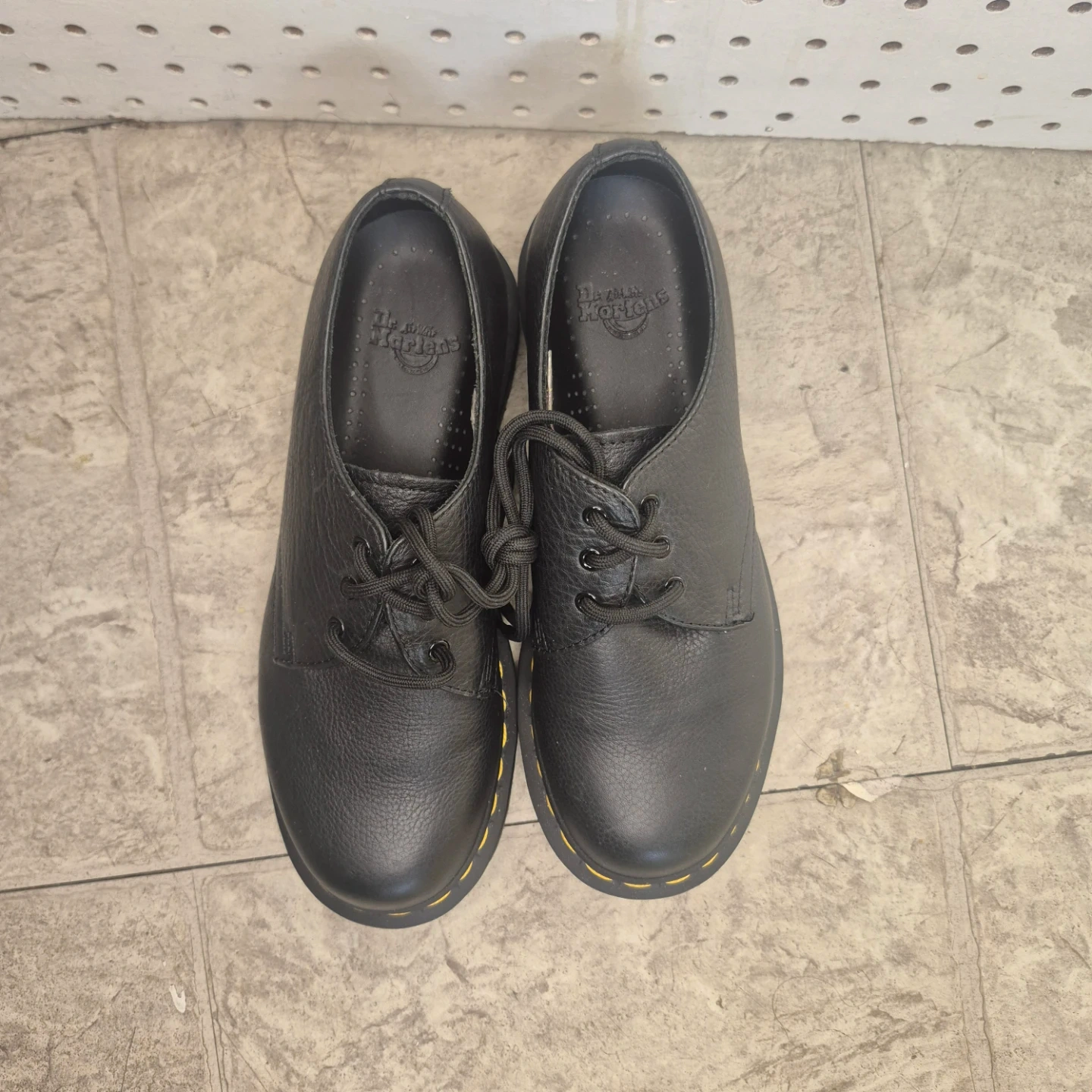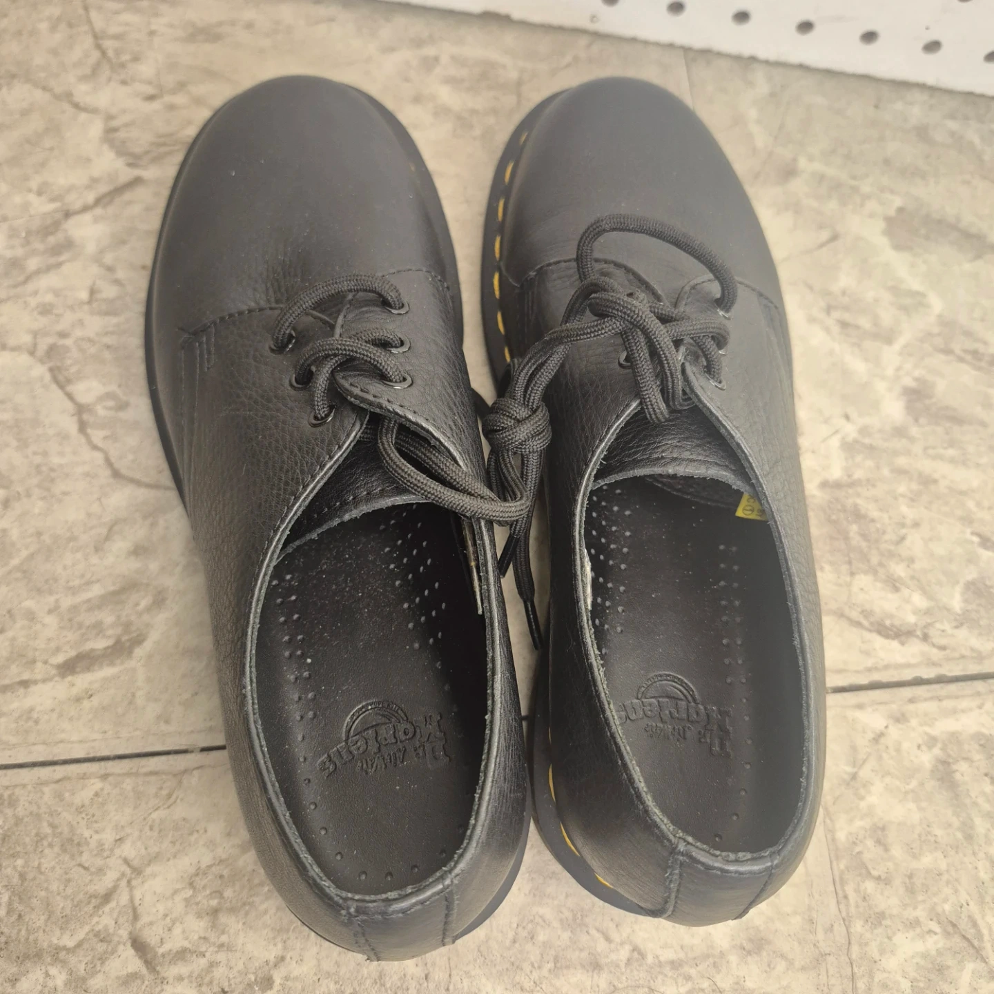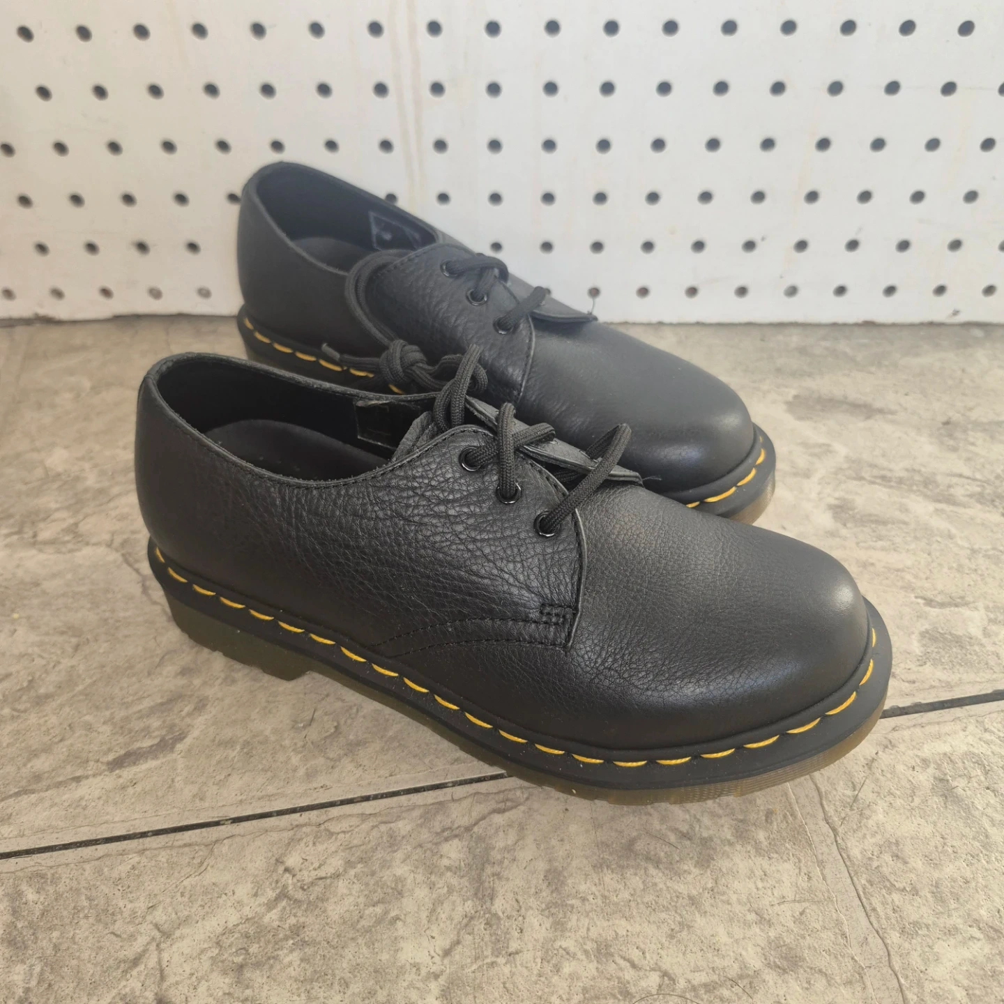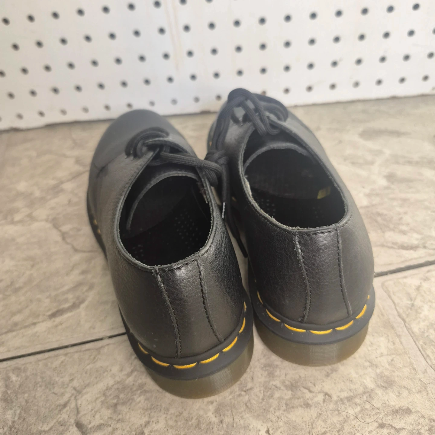 Classic Dr. Martens black leather Oxford shoes. These durable shoes feature a pebbled leather upper and the signature yellow stitching. Perfect for everyday wear and built to last!